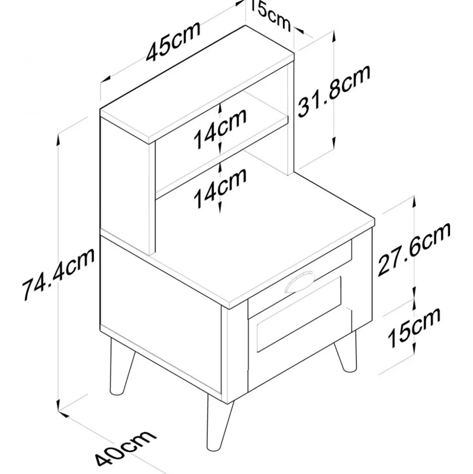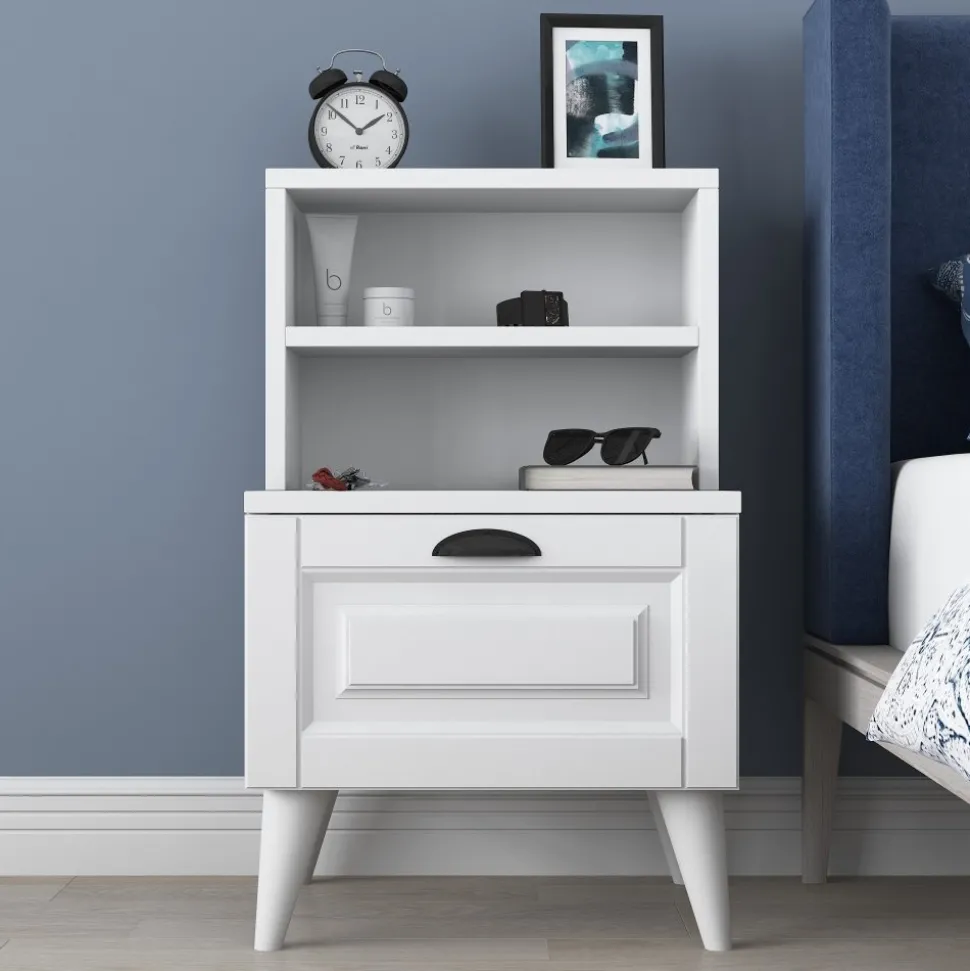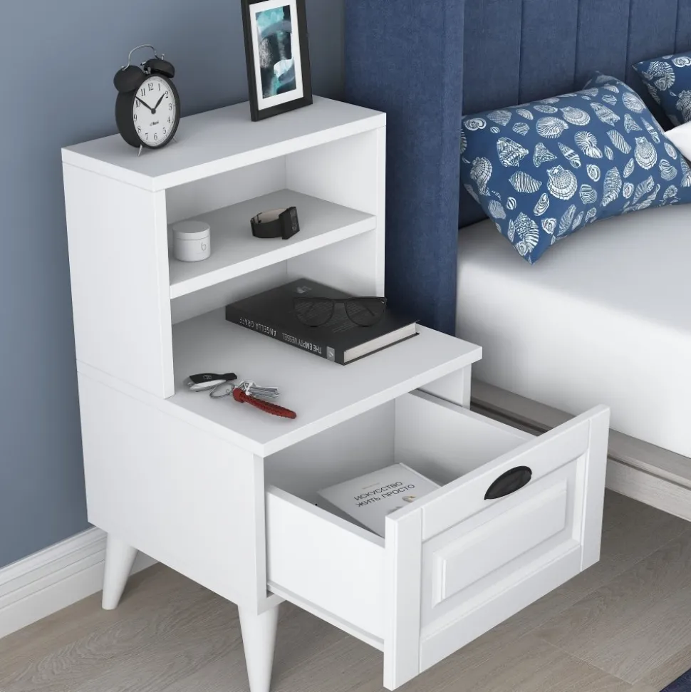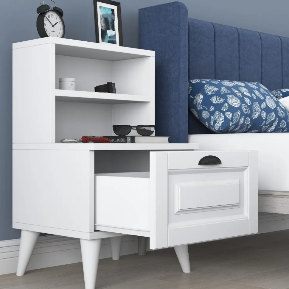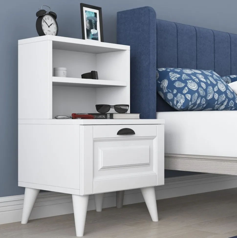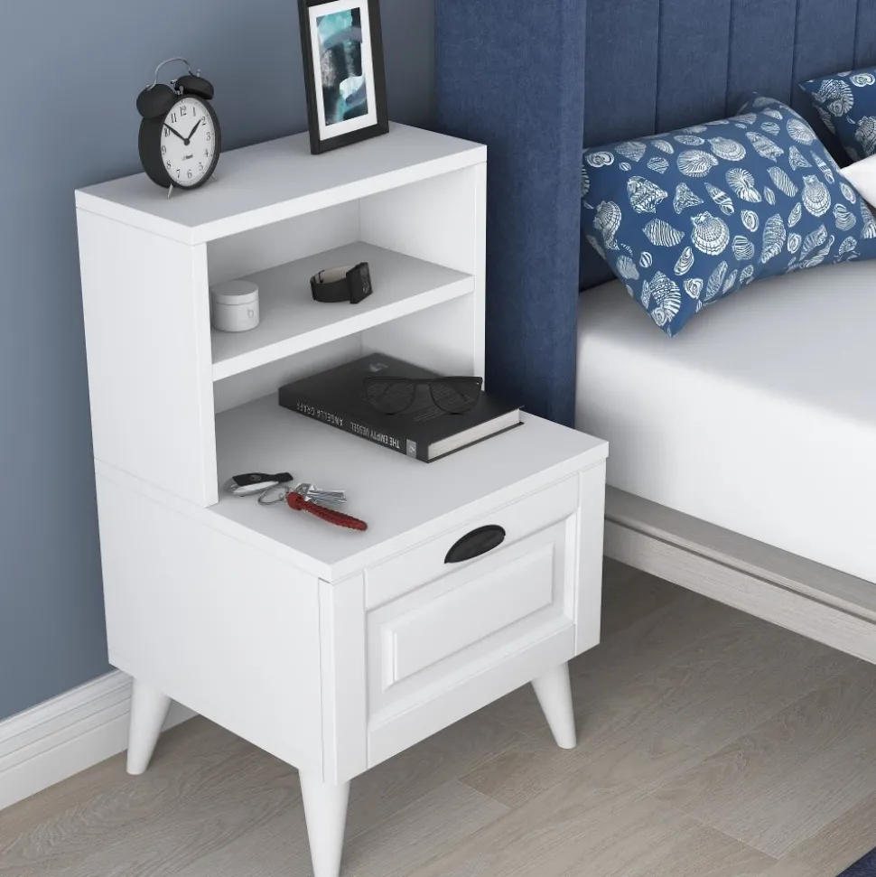 Sängbord av melaminbelagd spånskiva.