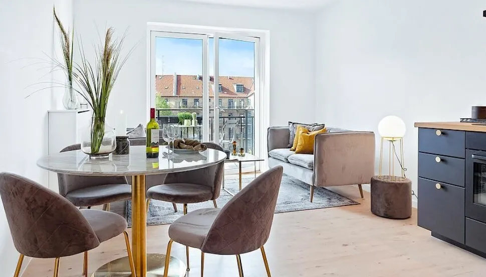 Matbord med bordsskiva i marmor imitation och ben i mässings utförande.