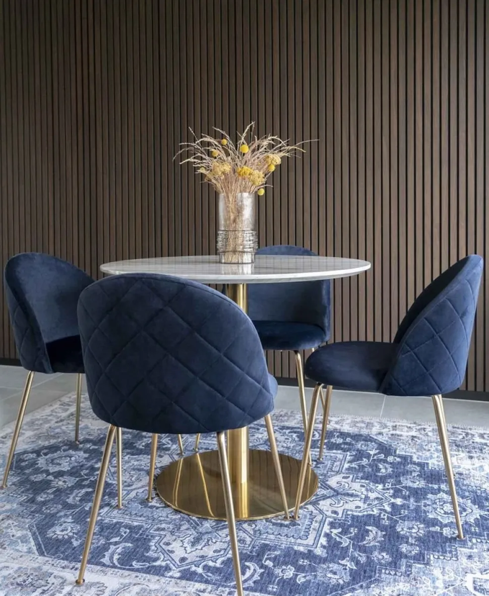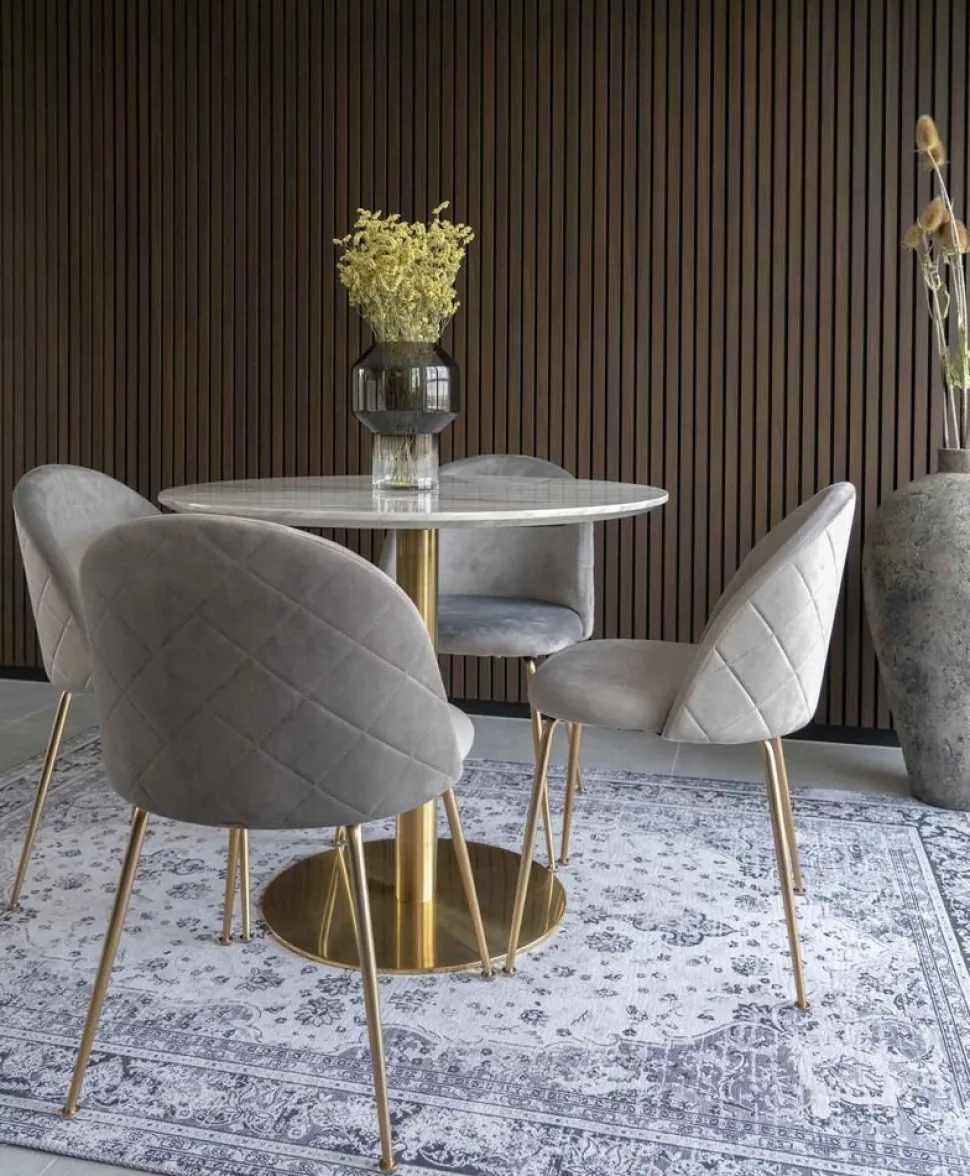 Matbord med bordsskiva i marmor imitation och ben i mässings utförande.