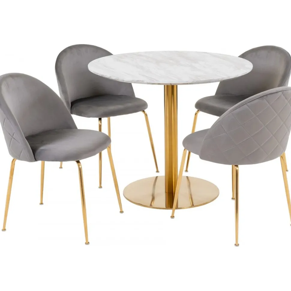 Matgrupp bestående av Bolzano matbord i vitt med guldfärgat underrede och 4 st Geneve matstolar i grått sammetstyg och guldfärgade ben. Levereras omonterad.