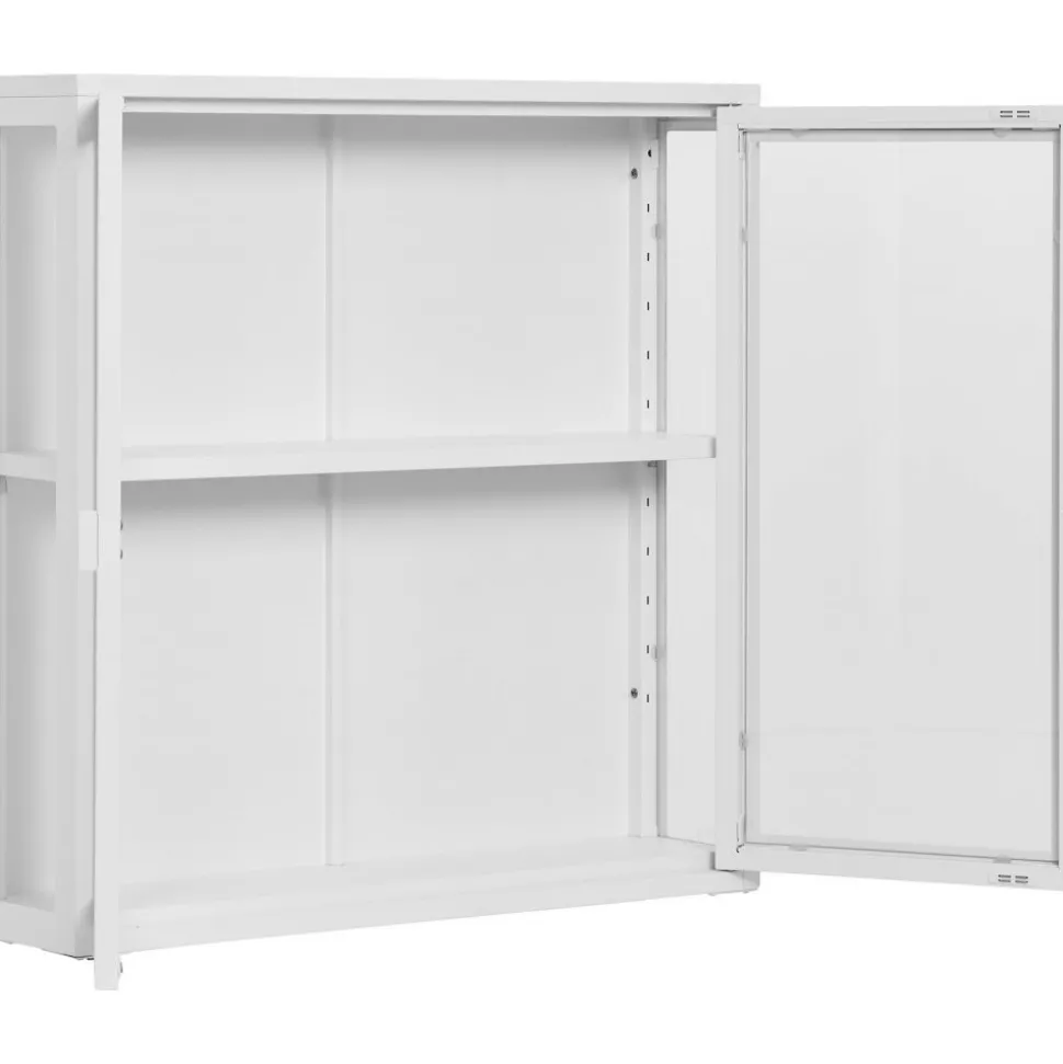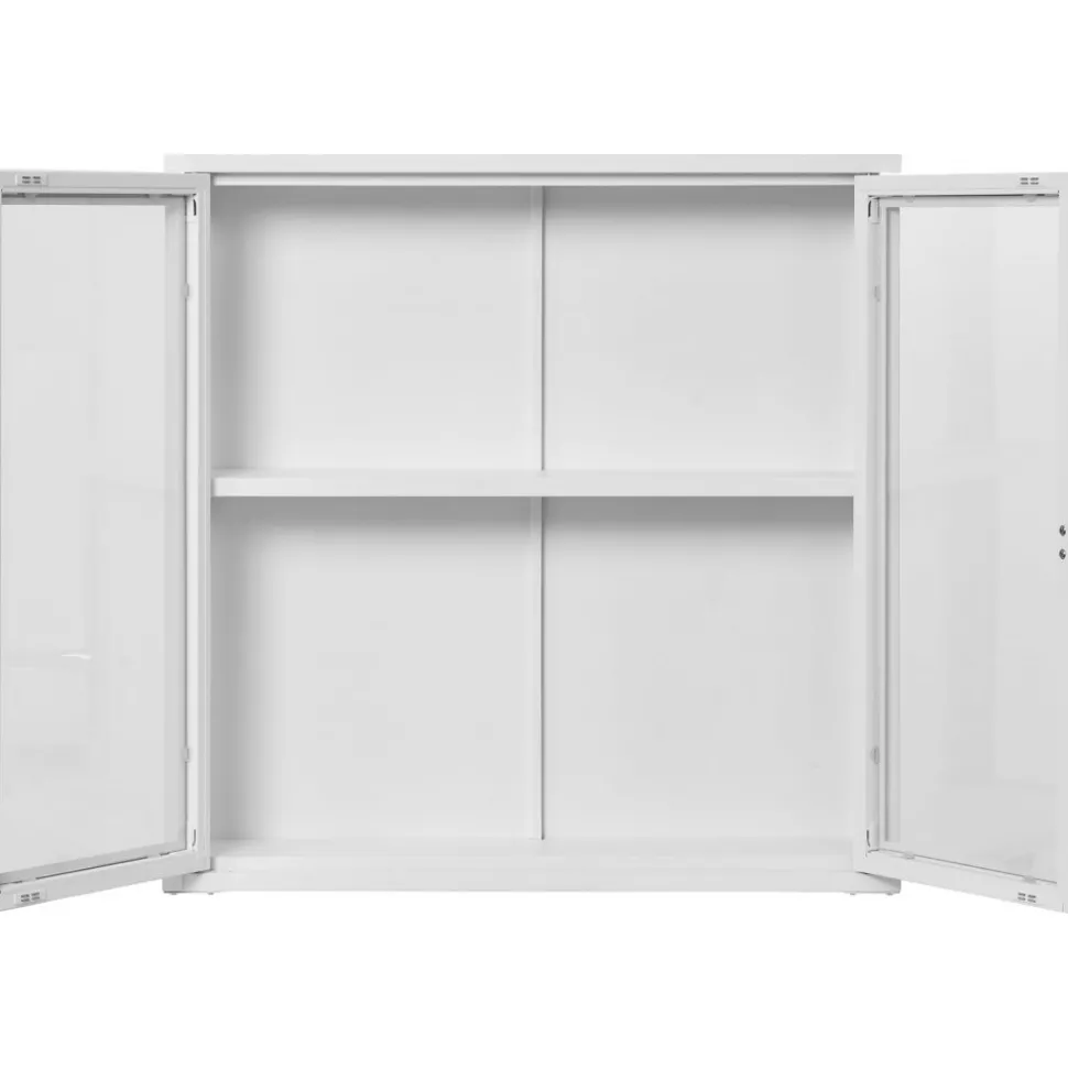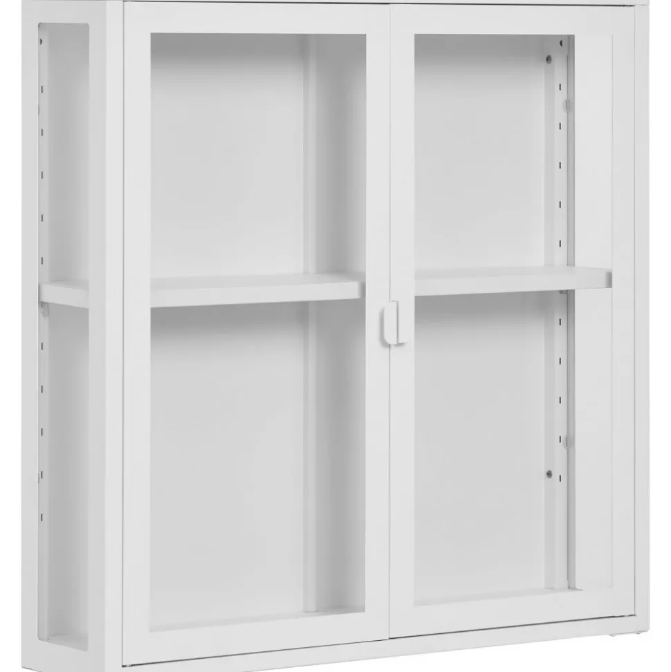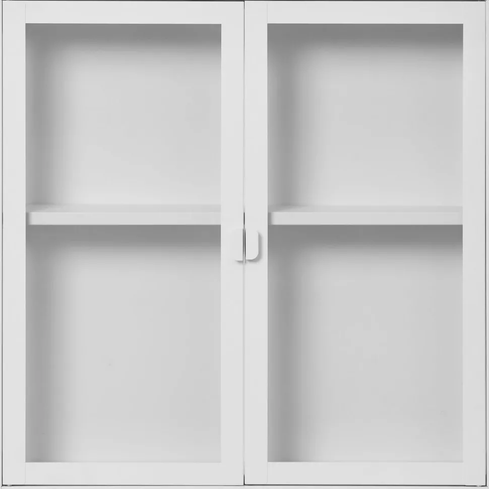 Vägghängande av stål med dörrar av glas.
