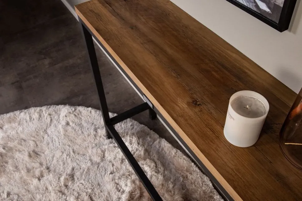 Avlastningsbord med toppskiva i MDF med mönster av vintage brun. Underrede i svart metall.