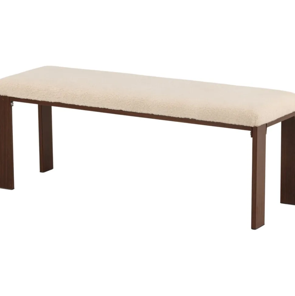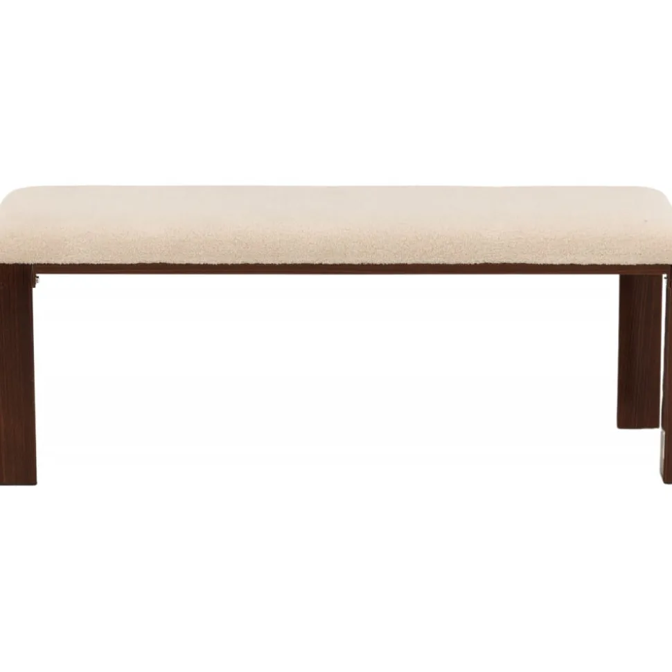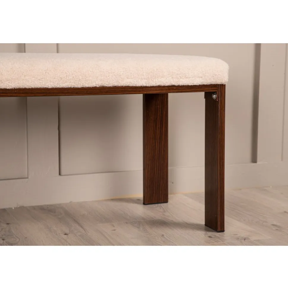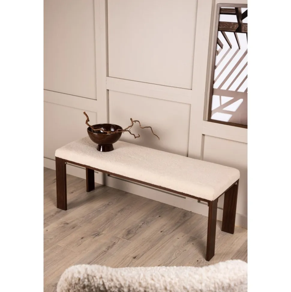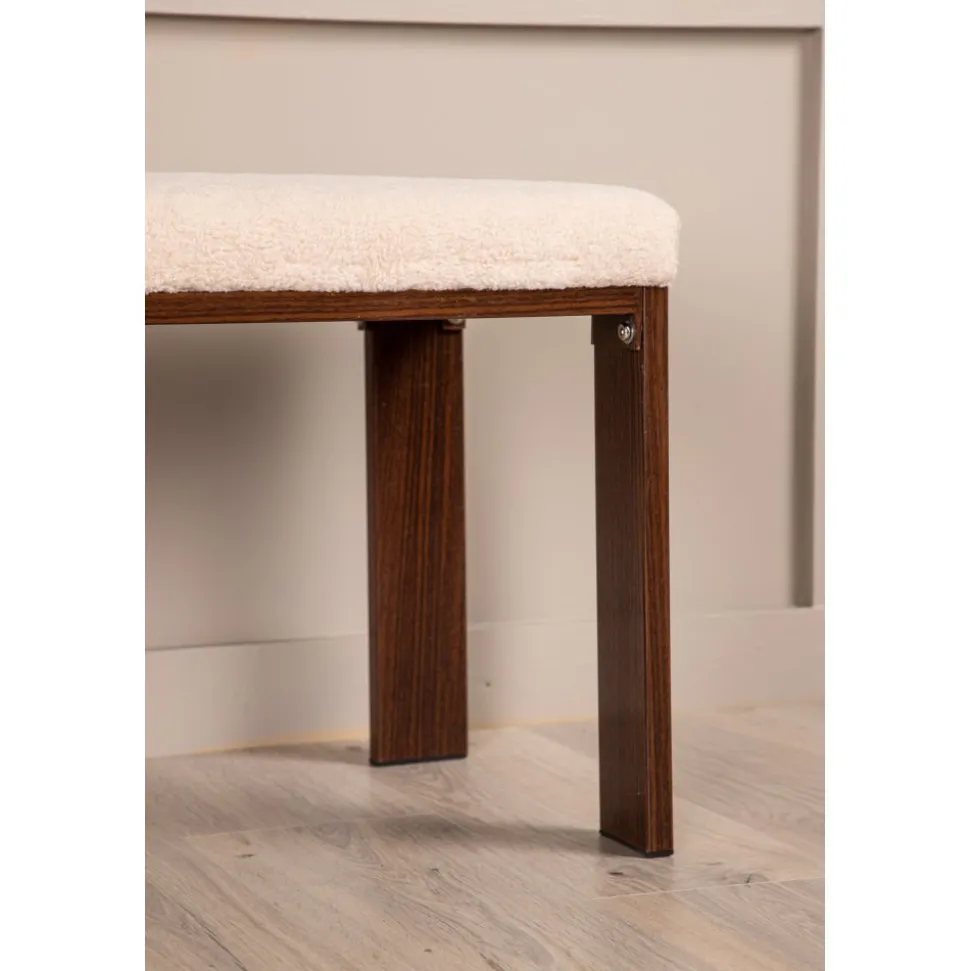 Bänk med rektangulär sits i mjukt fleecetyg med vit kulör och fyra ben i brunt valnötsfärgat trä. Den perfekta inredningsdetaljen till hallen eller vardagsrummet, som solitär stilikon eller för att skapa fler sittplatser i hemmet.