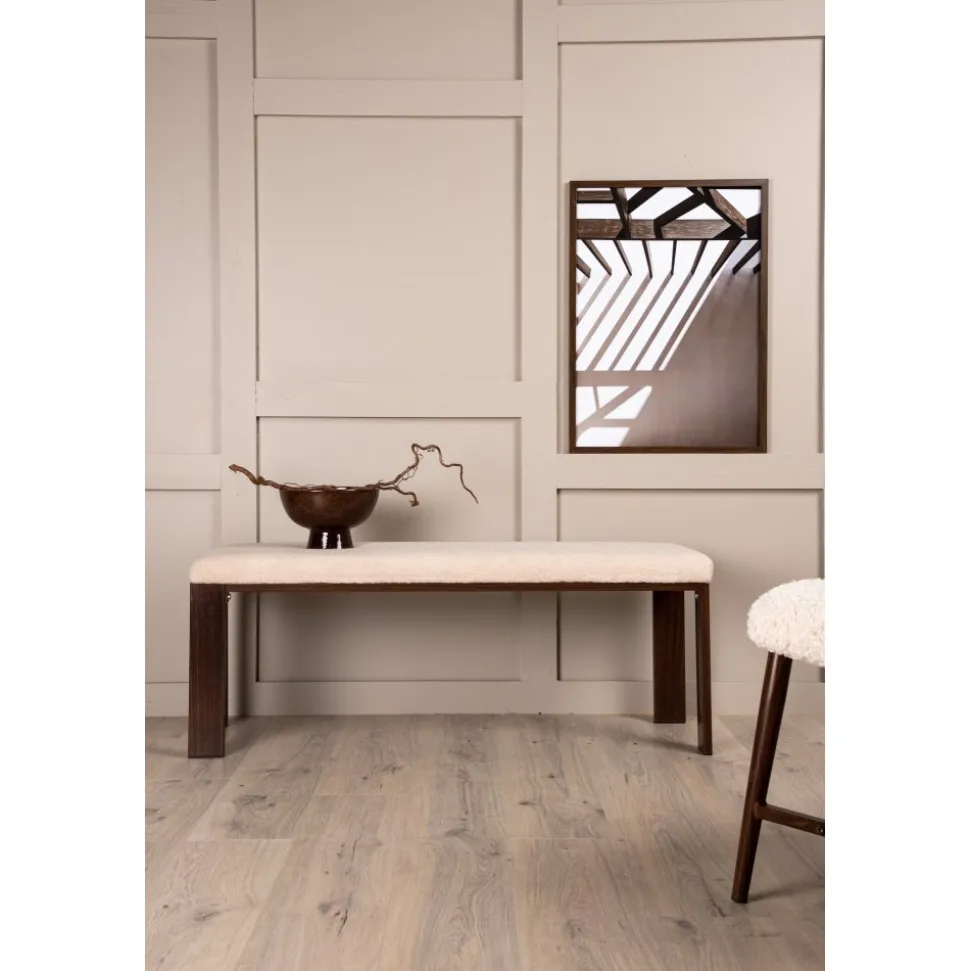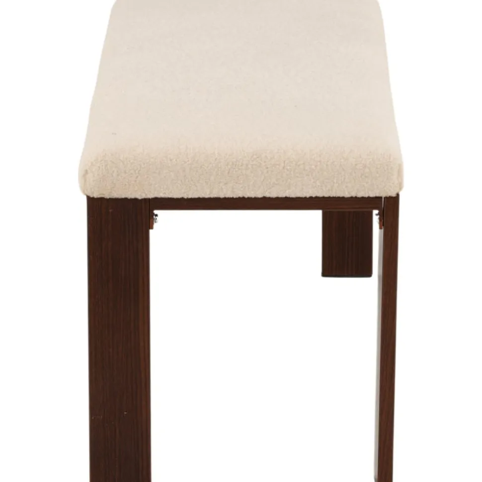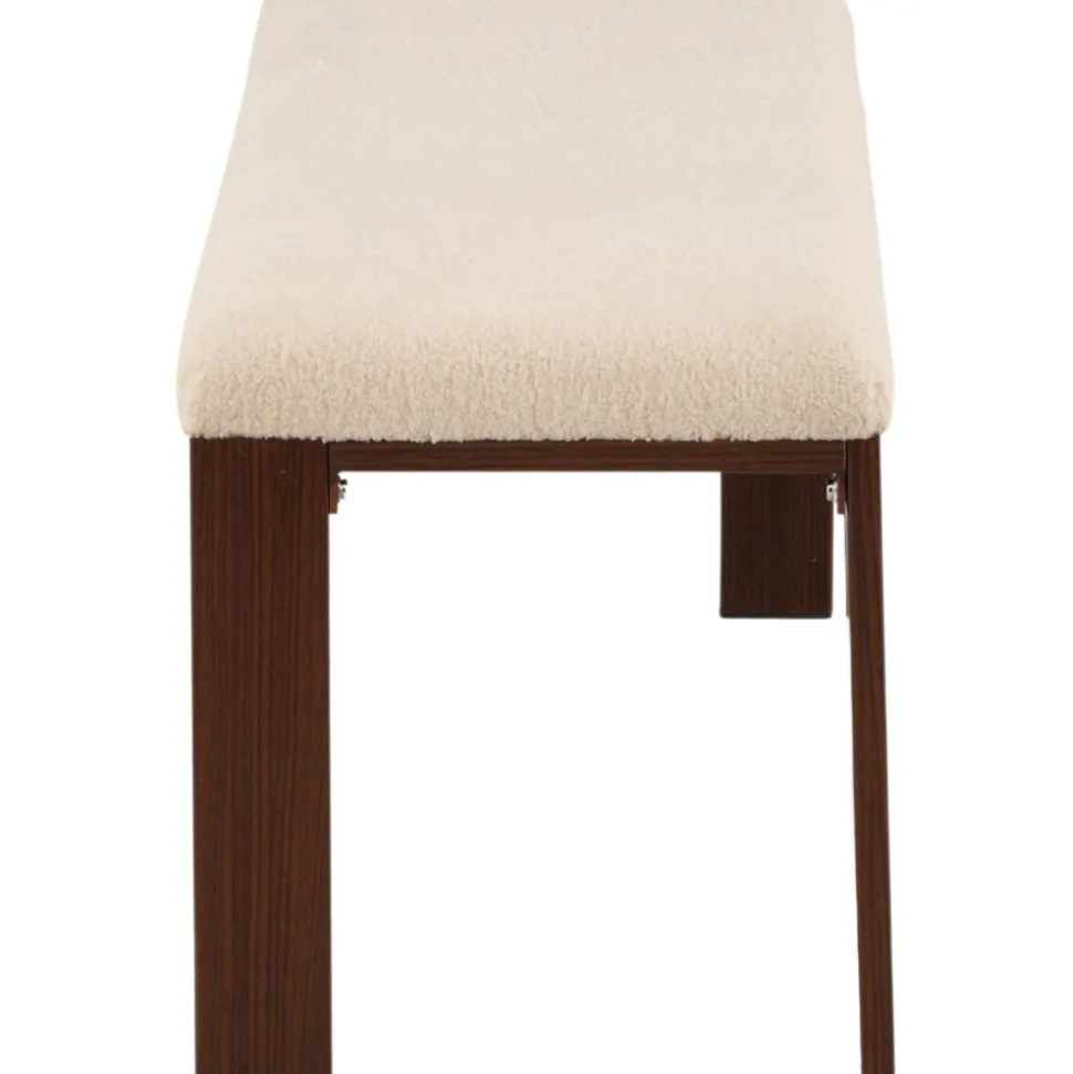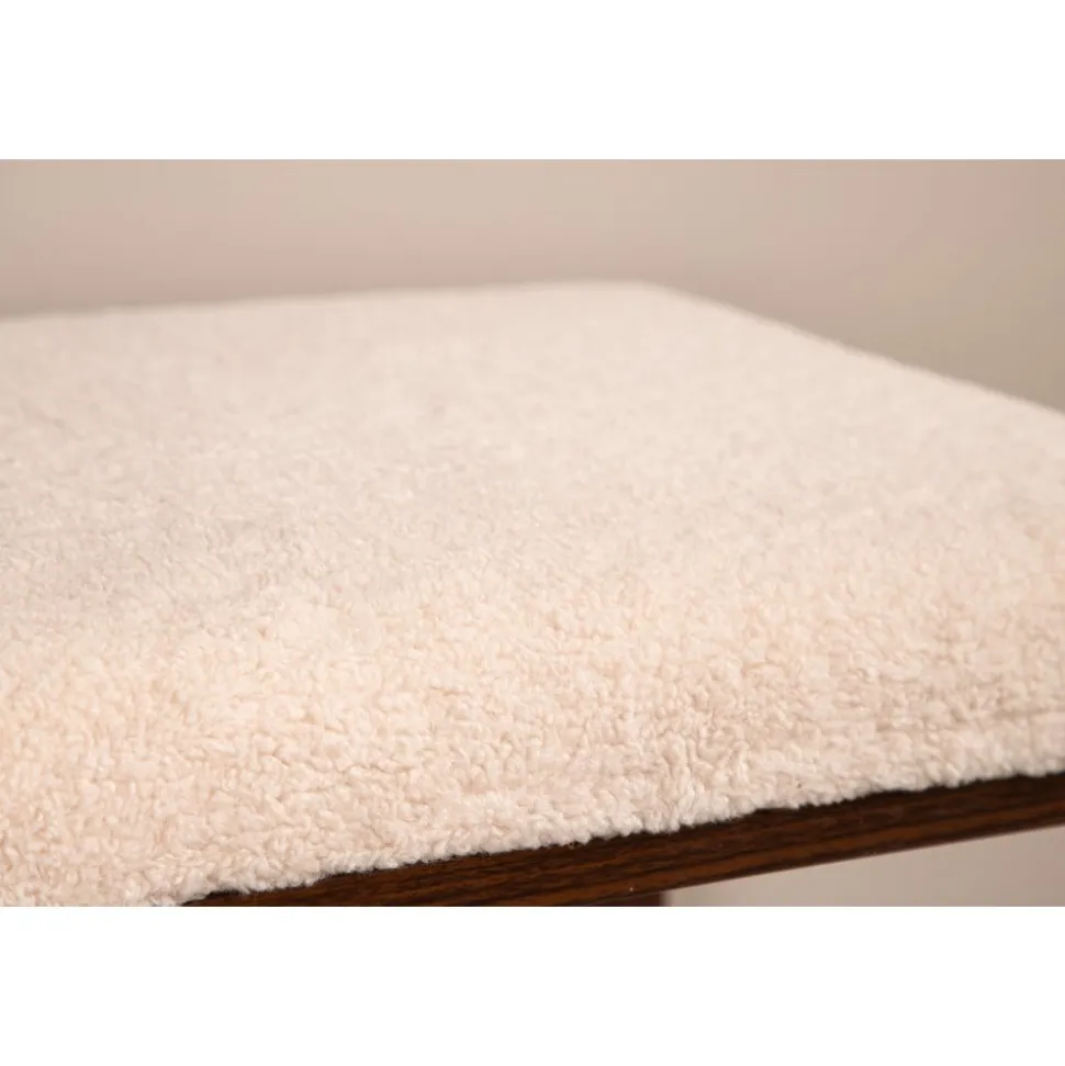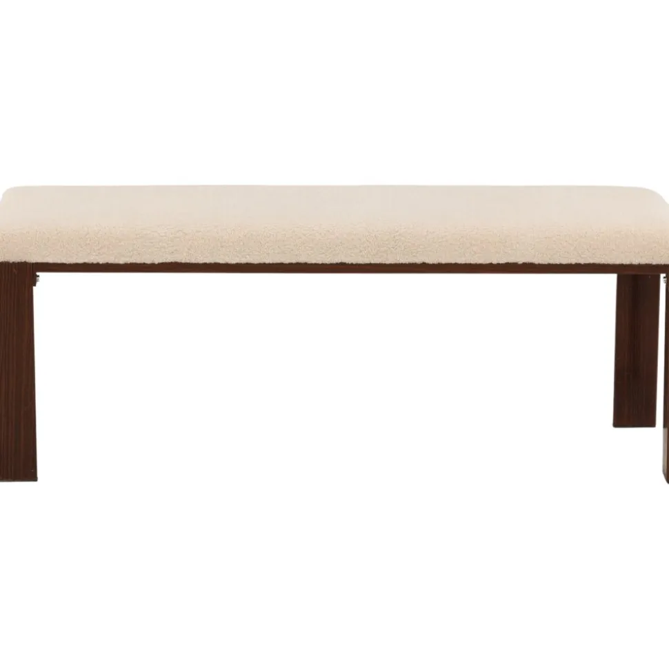 Bänk med rektangulär sits i mjukt fleecetyg med vit kulör och fyra ben i brunt valnötsfärgat trä. Den perfekta inredningsdetaljen till hallen eller vardagsrummet, som solitär stilikon eller för att skapa fler sittplatser i hemmet.