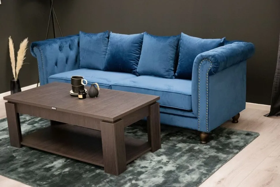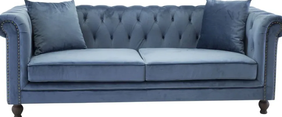 Stilig klädd med ett blått sammetstyg. Dekorativa nitar framtill. Stommen är av massivt trä.