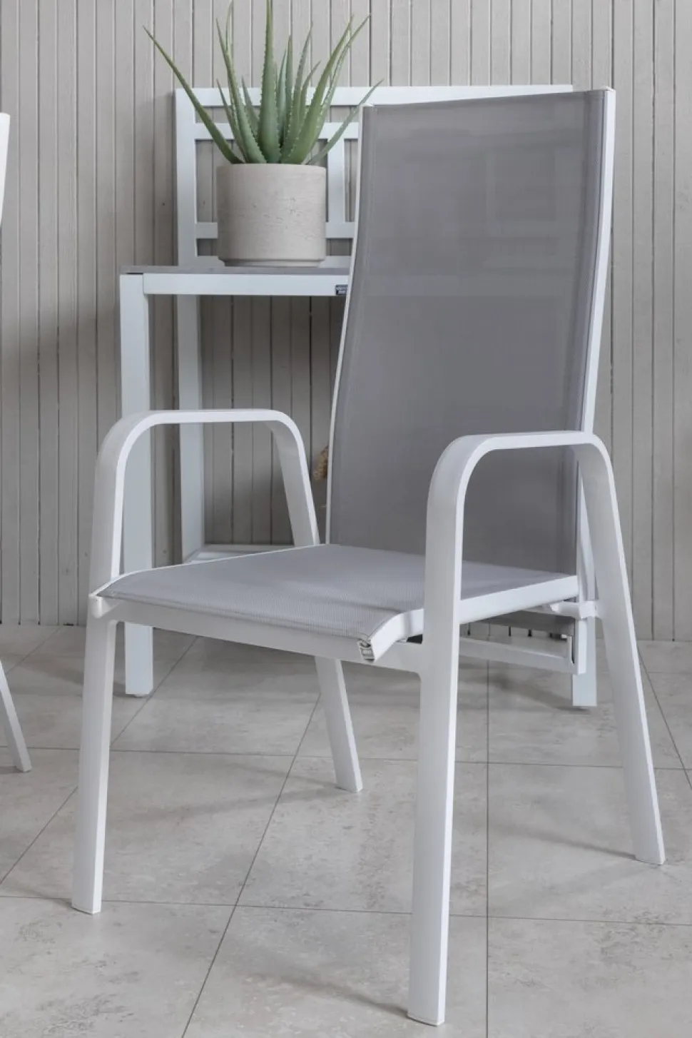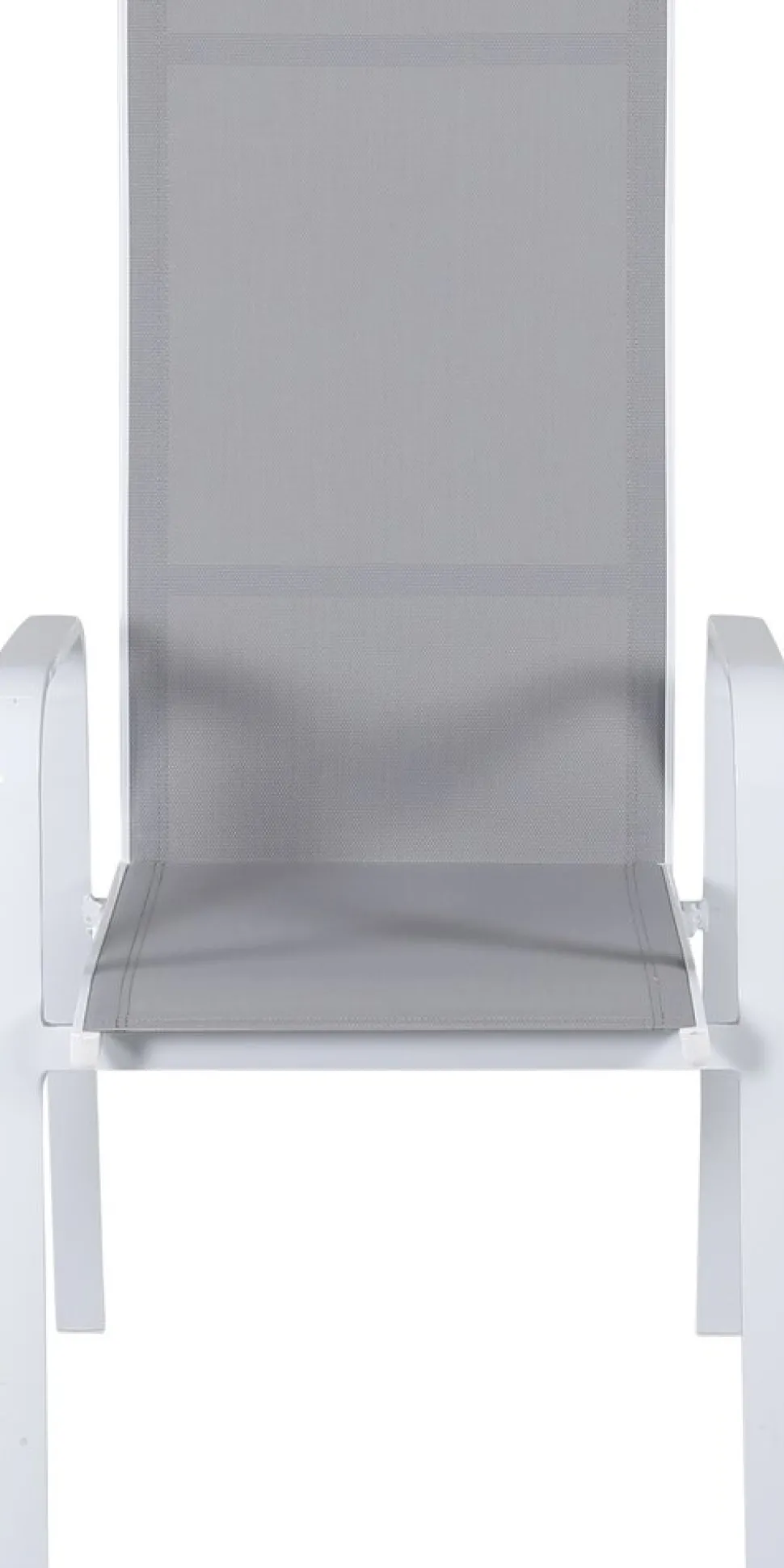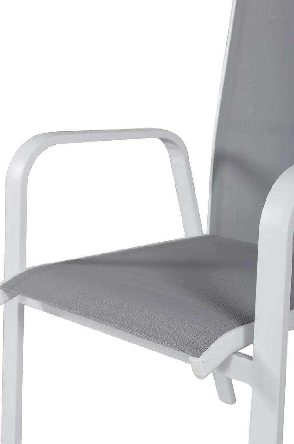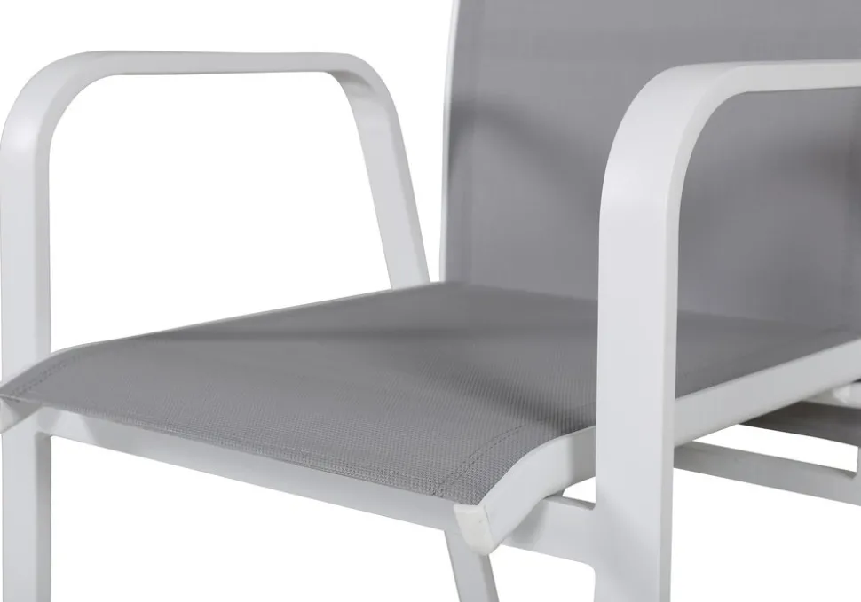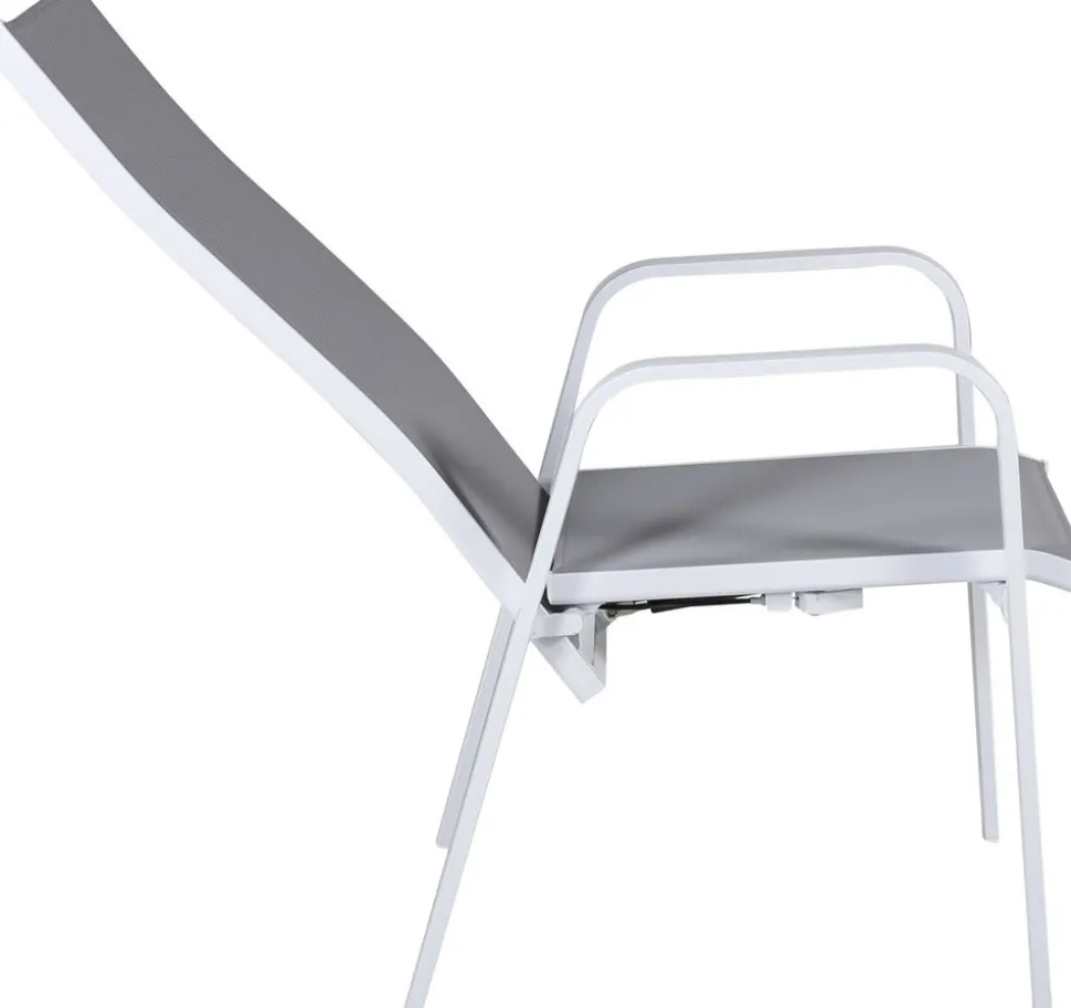 Vitgrå stapelbar karmstol från serien Copacabana som gör sig bra vid matbordet på altanen. Stolens ryggstöd går att fälla vilket gör att den är väldigt bekväm och praktisk. Njut av sommaren på allra bästa sätt! Skötselråd: Textilene är ett syntetiskt tyg som är tillverkat av PVC-behandlad polyester. Materialet är vattenresistent och UV-behandlat för att motverka solens blekning. Rengöring bör göras ungefär en gång i månaden, använd en fuktig trasa och torka av.