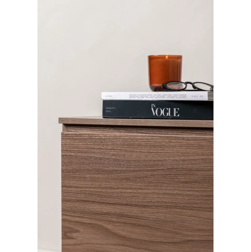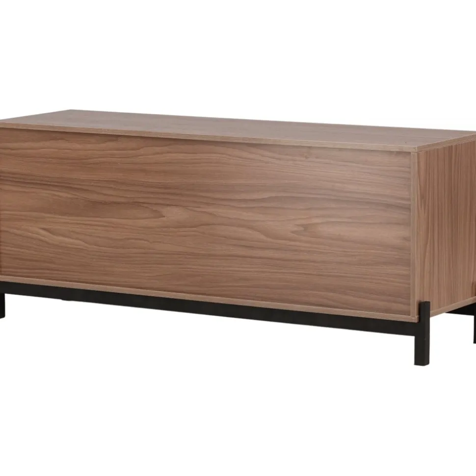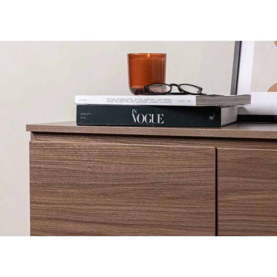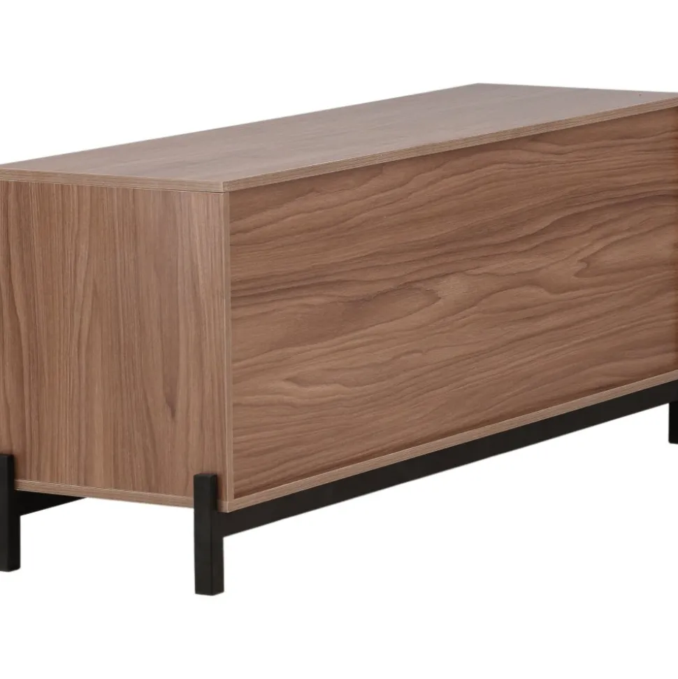 Lika praktisk som stilren! Den robusta designen ger ett stadigt intryck och den valnötsfärgade kulören skapar en trivsam värme i hemmet. Tillverkad i valnötsfärgad MDF och upplyft av fyra svarta ben i dekorativ design. Den här möblen har två vänsterjusterade skåp och två högerjusterade lådor som möjliggör generöst med plats för dold förvaring.