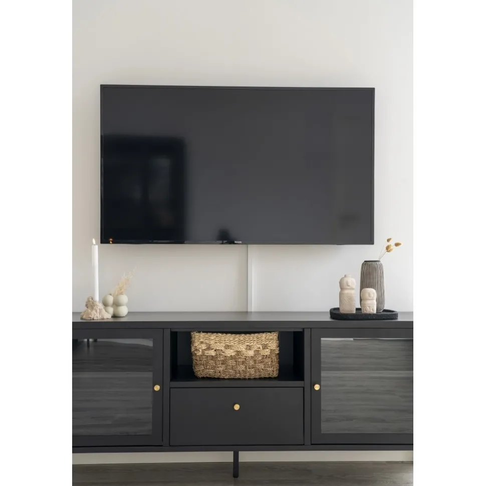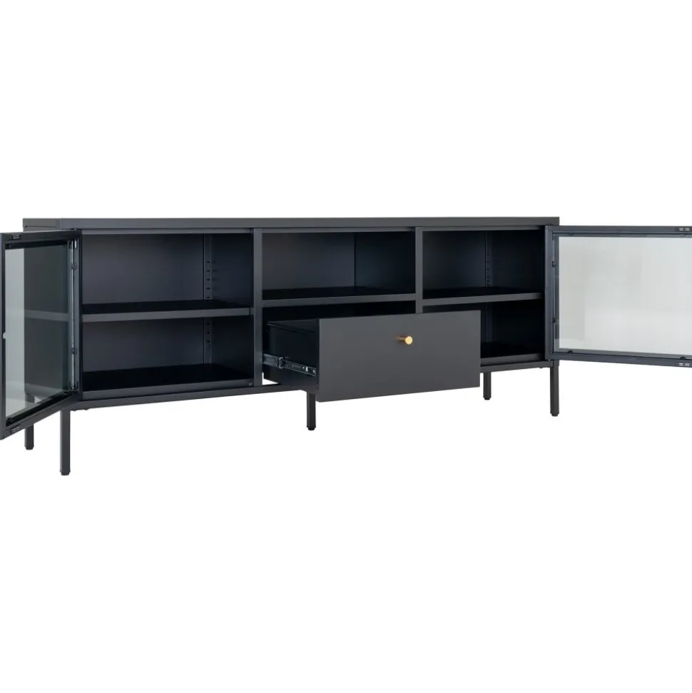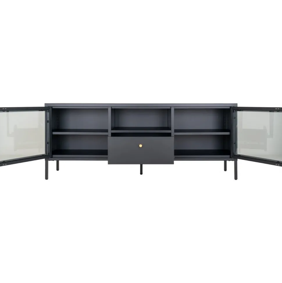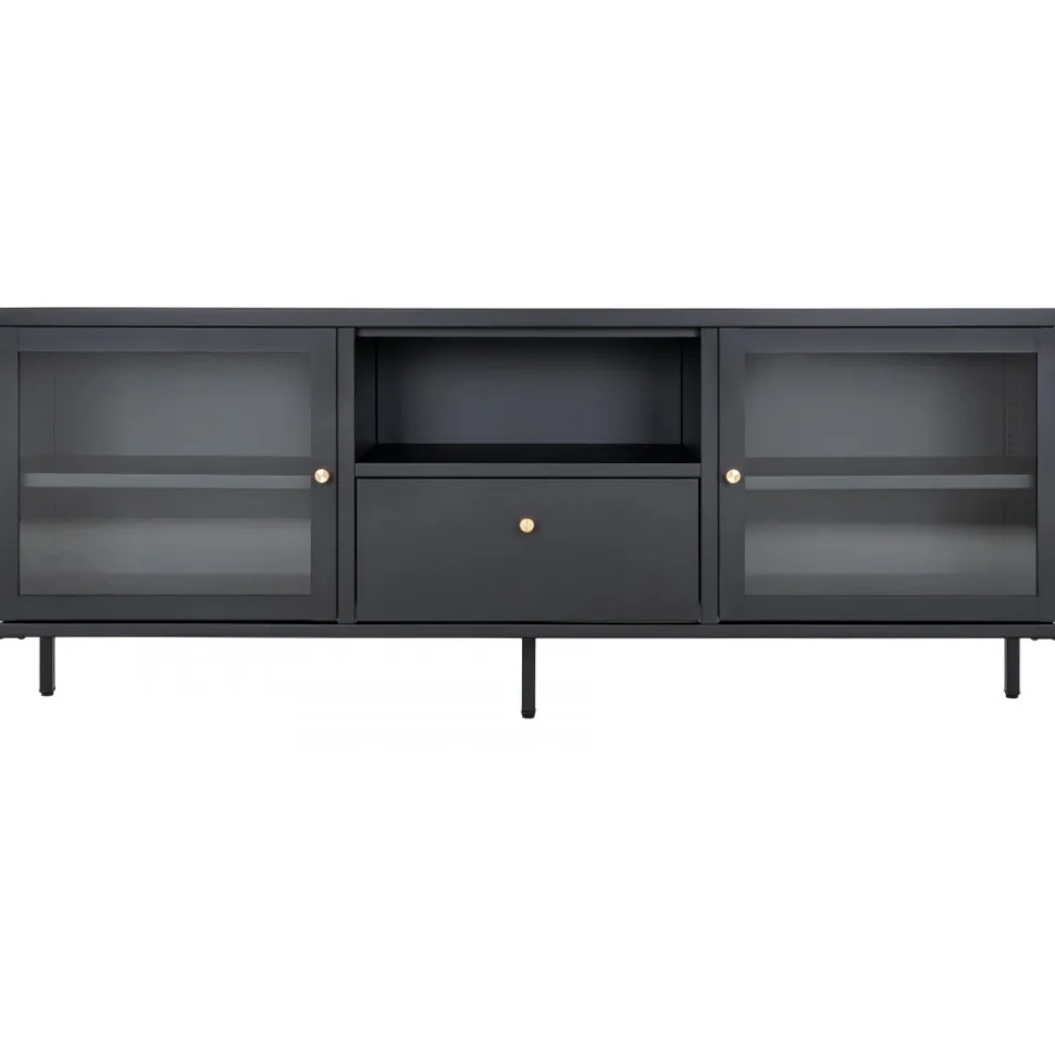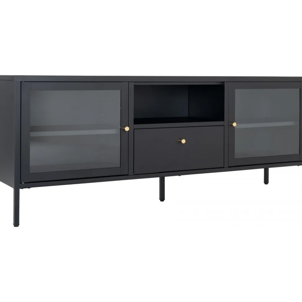 Mediabänk av stål med glasdörrar.