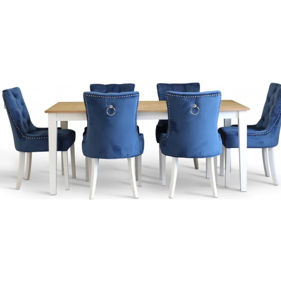 Dalsland med stort och bra matbord med toppskiva i oljad ek och vitlackat underrede. 6 st sköna Tuva Decutique stolar i blå sammet med vita ben.