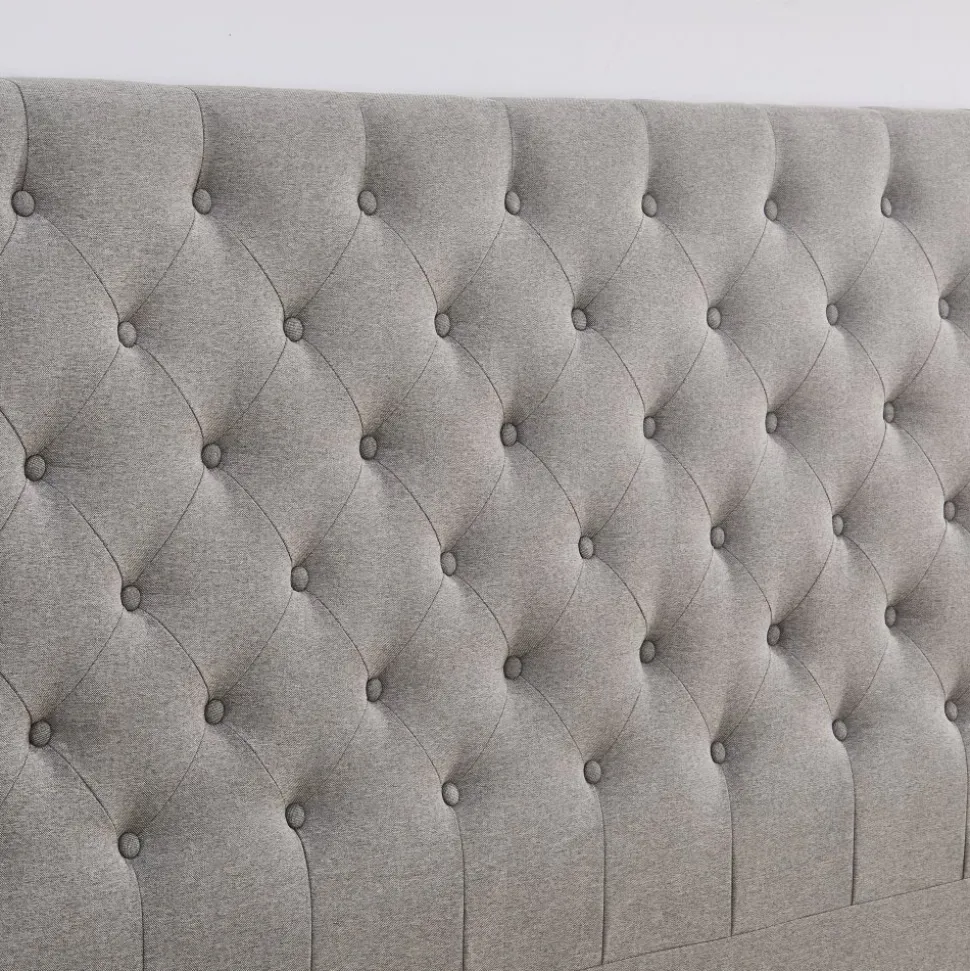 Deluxe pikerad Sänggavel 180 cm bred. Totalhöjd 125 cm inklusive ben. Grått tyg.