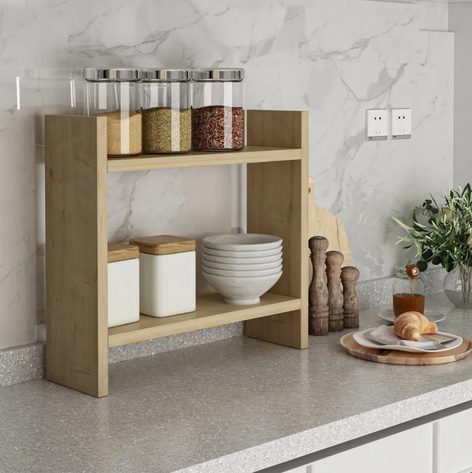 Med sin moderna design och ekfärg kommer den här kökshyllan omedelbart att lyfta utseendet på ditt kök. Det är den perfekta blandningen av stil och funktionalitet, vilket gör den till ett måste för alla hemmakockar och köksentusiaster.