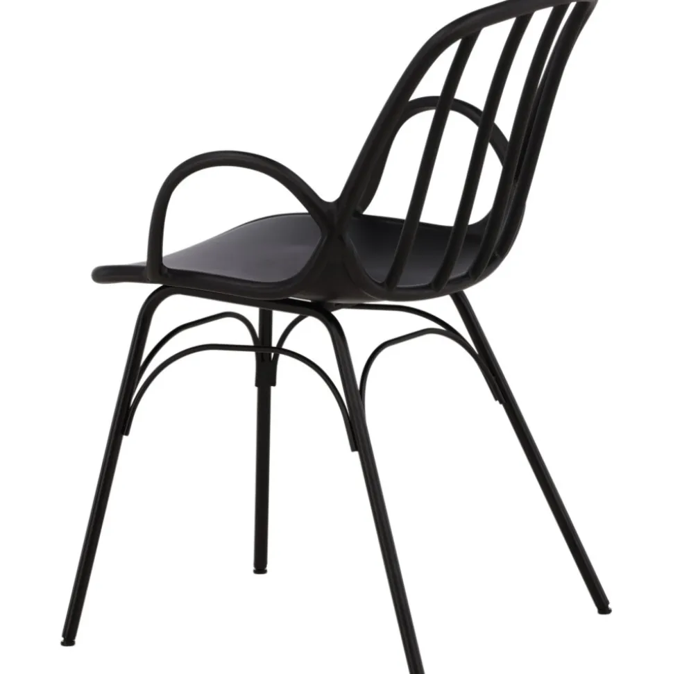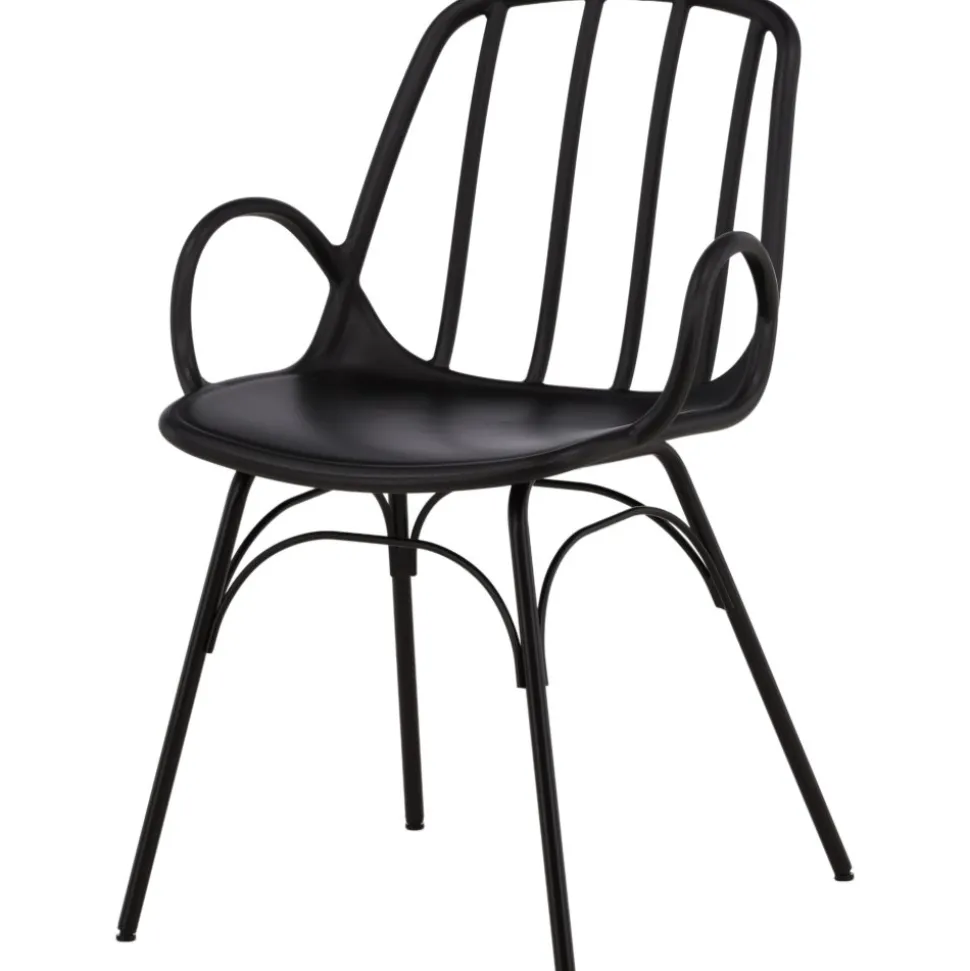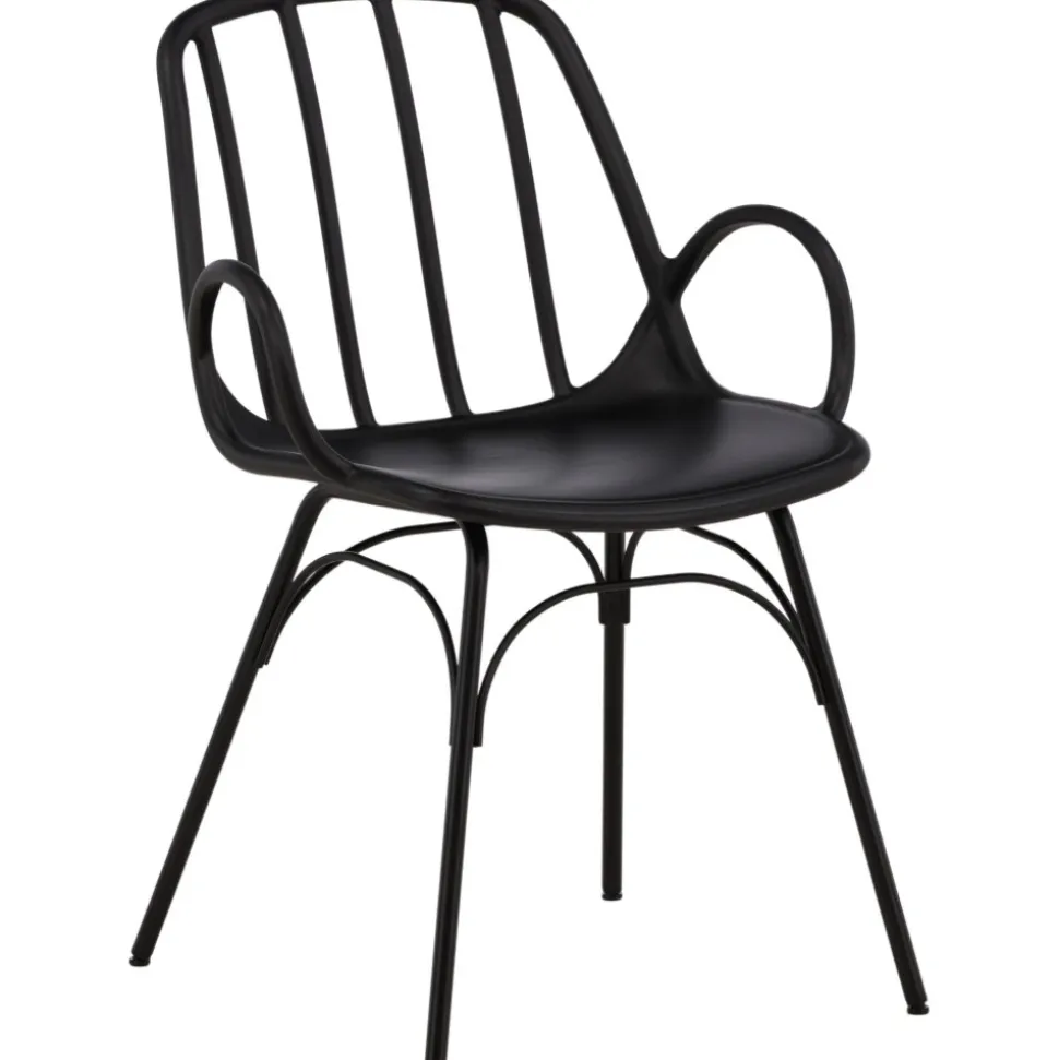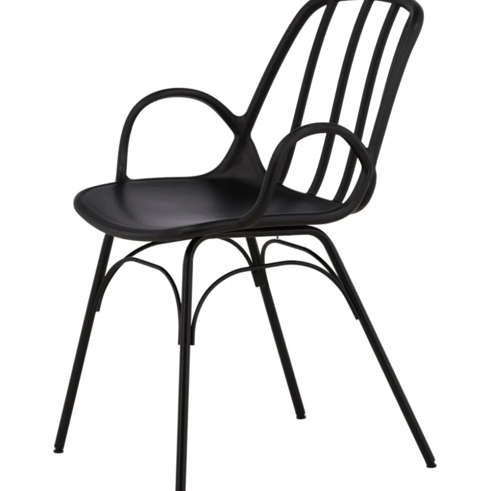 Matstol som skapar en personlig och modemedveten atmosfär i ditt hem! Den här läckra matstolen är lika stilren som praktisk, tillverkad i svart plast och stål. Sitsen har integrerade armstöd och en ribbad design i den lätt rundade ryggen. Stolsbenen är stilrent smala och lätt utsvängda i skandinavisk design. Möblera kring ett matchande matbord så får du en komplett matgrupp att avnjuta dina måltider kring! Levereras omonterad.