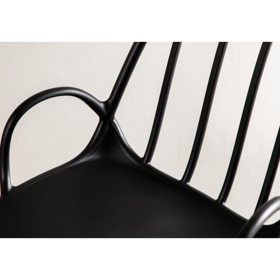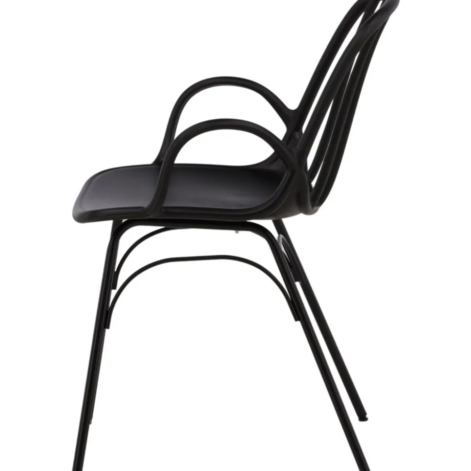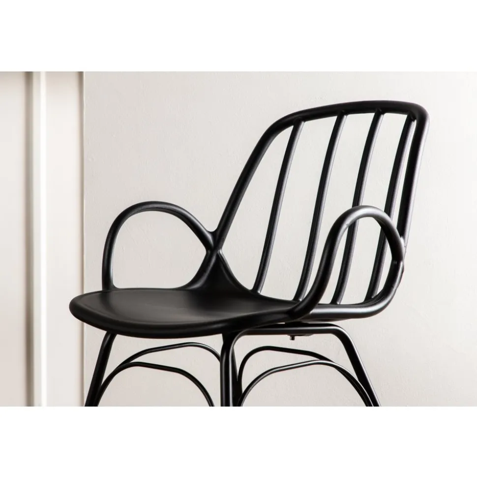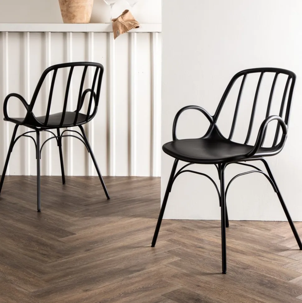 Matstol som skapar en personlig och modemedveten atmosfär i ditt hem! Den här läckra matstolen är lika stilren som praktisk, tillverkad i svart plast och stål. Sitsen har integrerade armstöd och en ribbad design i den lätt rundade ryggen. Stolsbenen är stilrent smala och lätt utsvängda i skandinavisk design. Möblera kring ett matchande matbord så får du en komplett matgrupp att avnjuta dina måltider kring! Levereras omonterad.