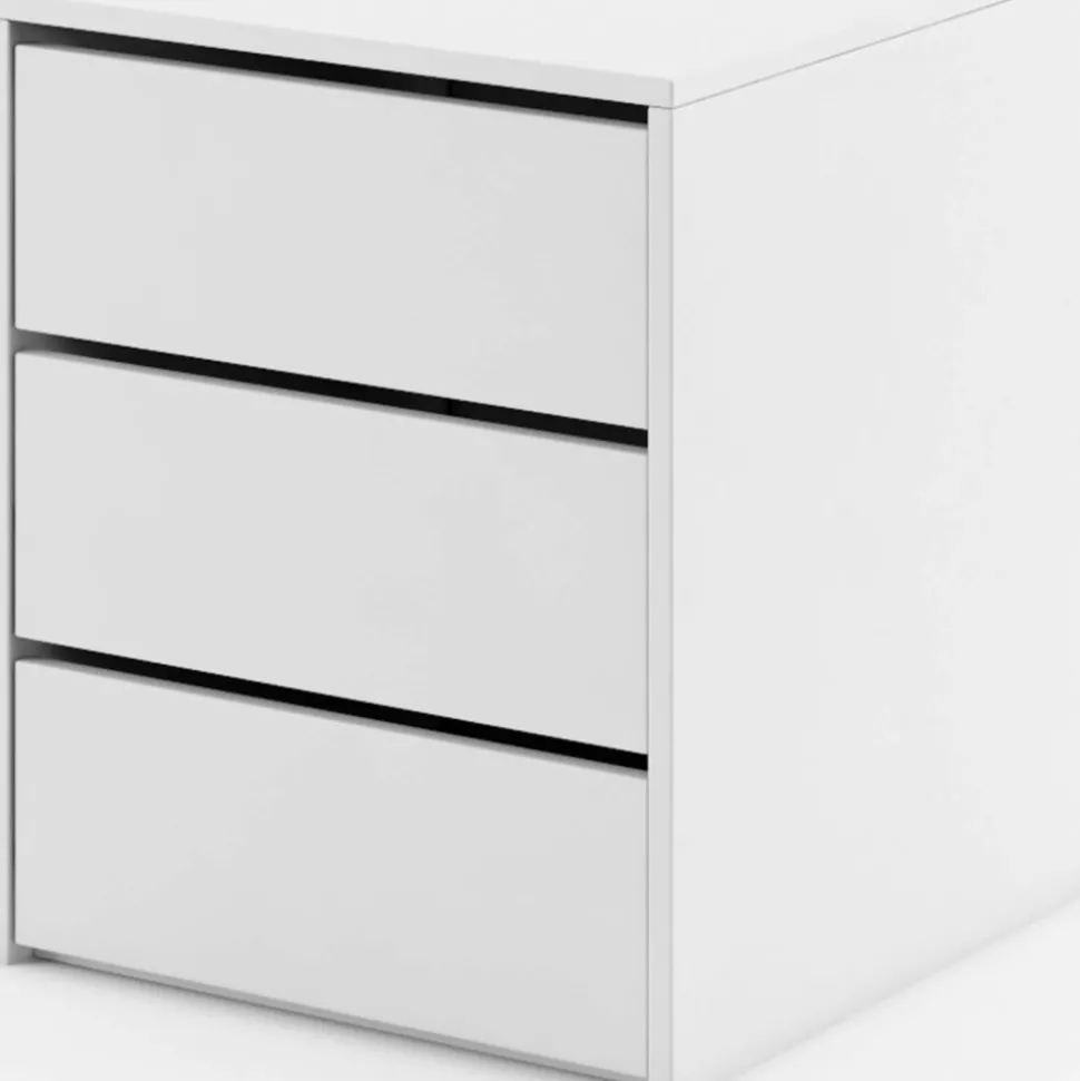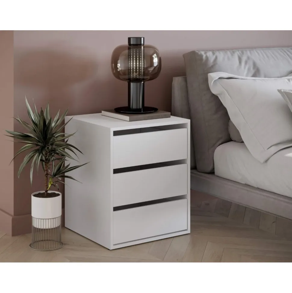 Byrå av spånskiva. Handtag av plast med matt finish. Levereras omonterad.