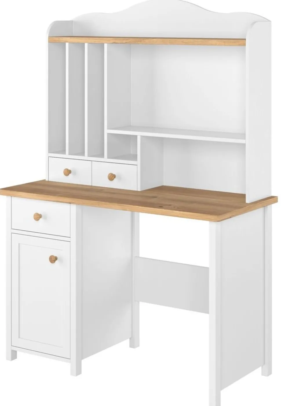 Ett snyggt skrivbord med en klassisk design. Tillverkad i MDF med god bordsyta samt ett skåp och två lådor för smart förvaring, samt ett flertal hyllplan.