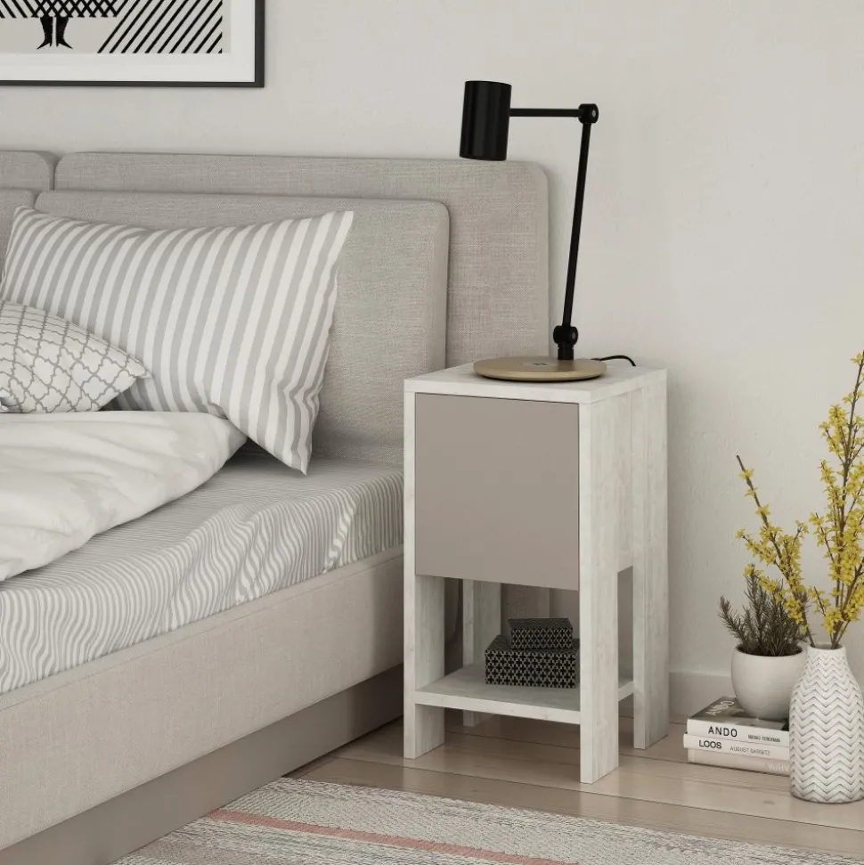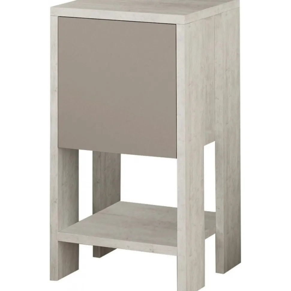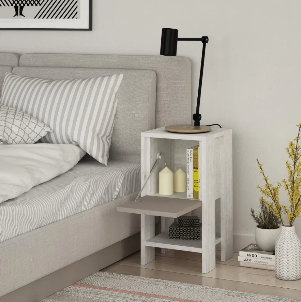Sängbord av melaminbelagd spånskiva.