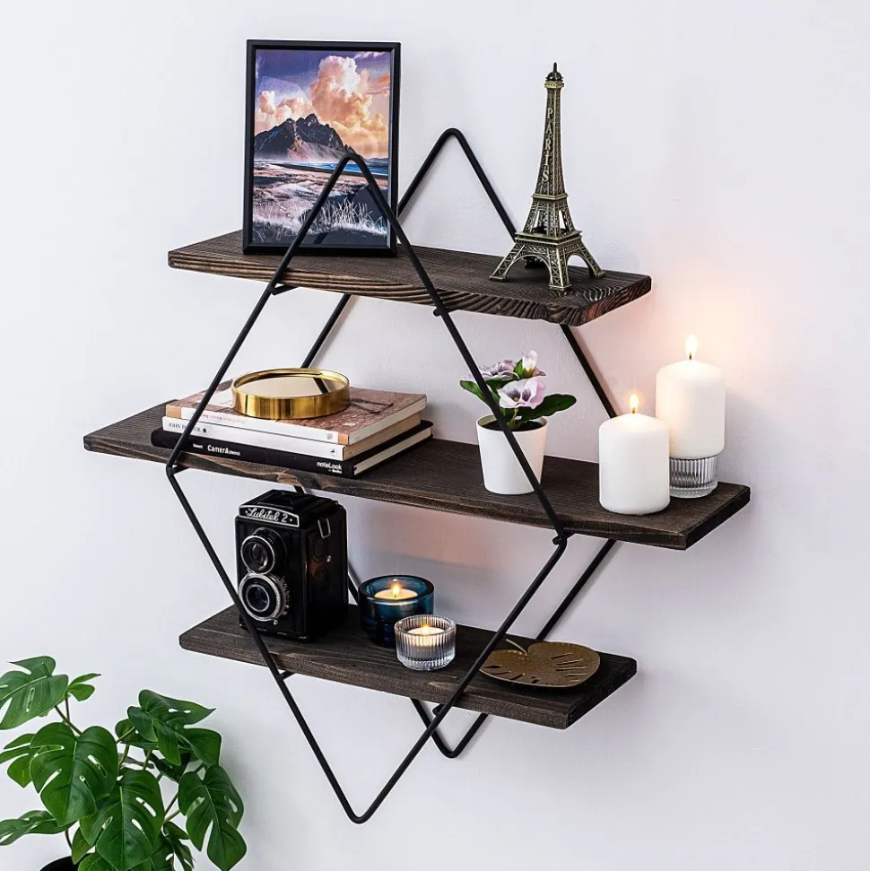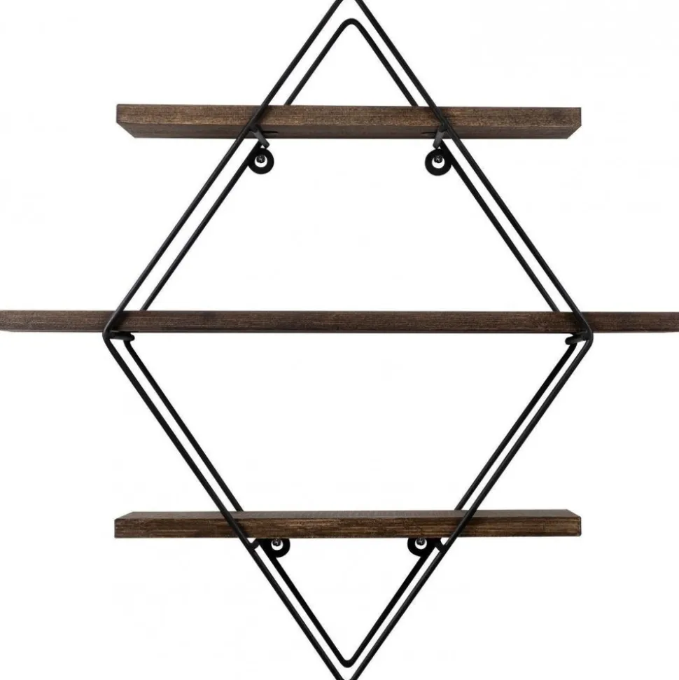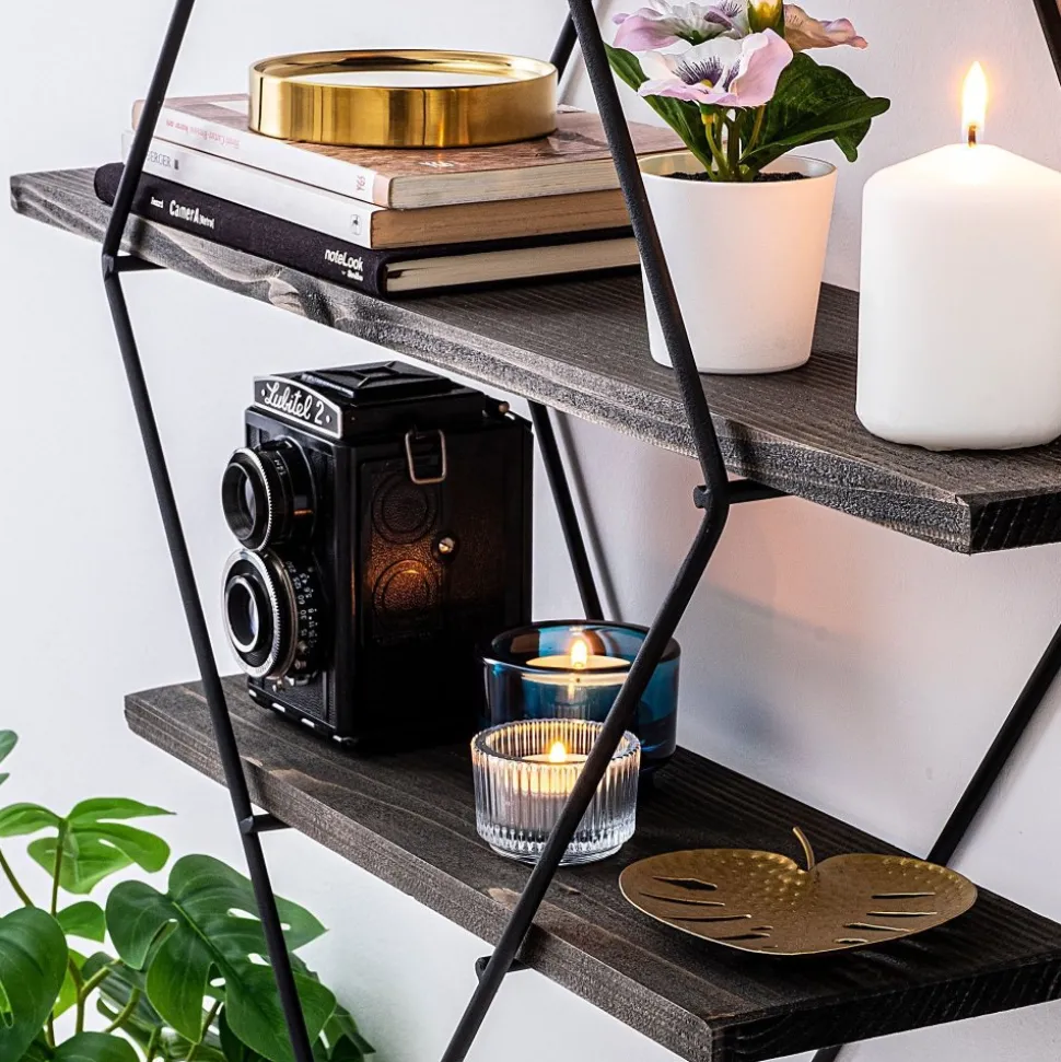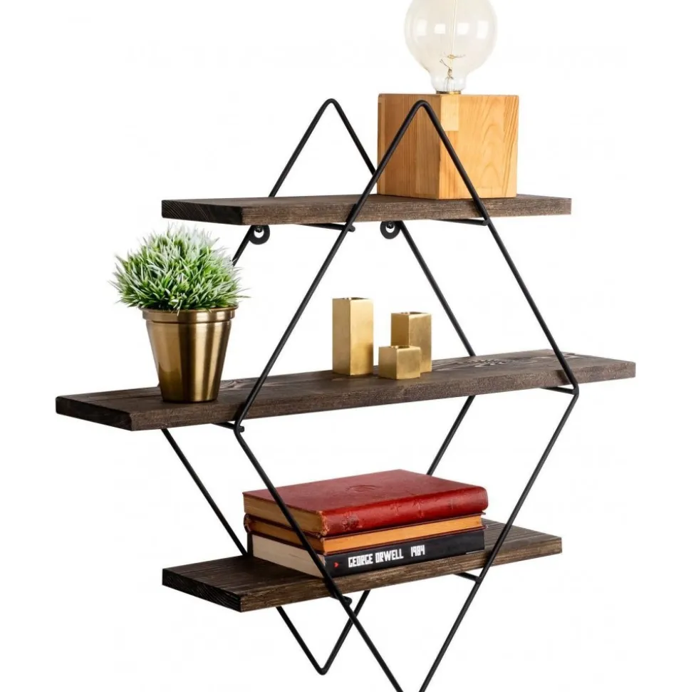 Vägghylla av trä och metall.