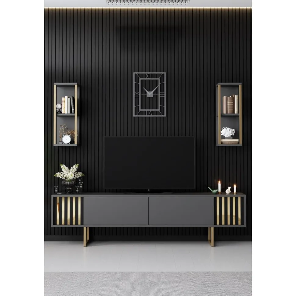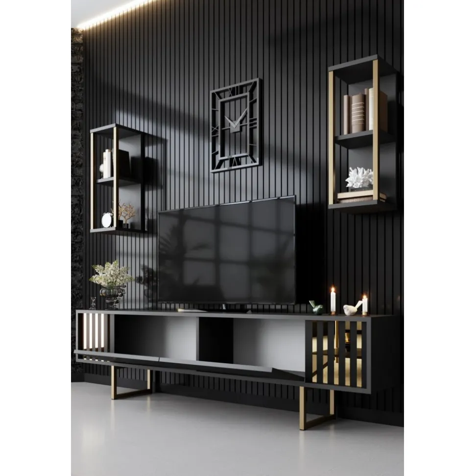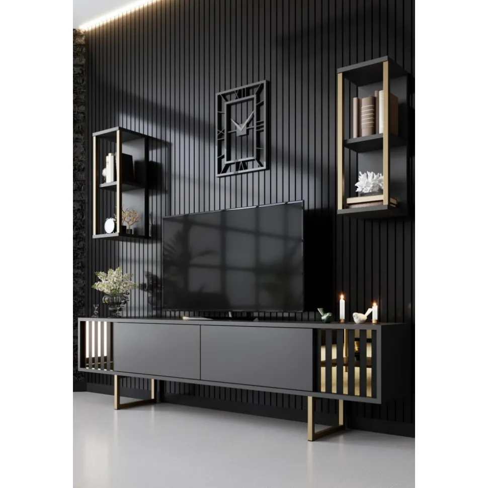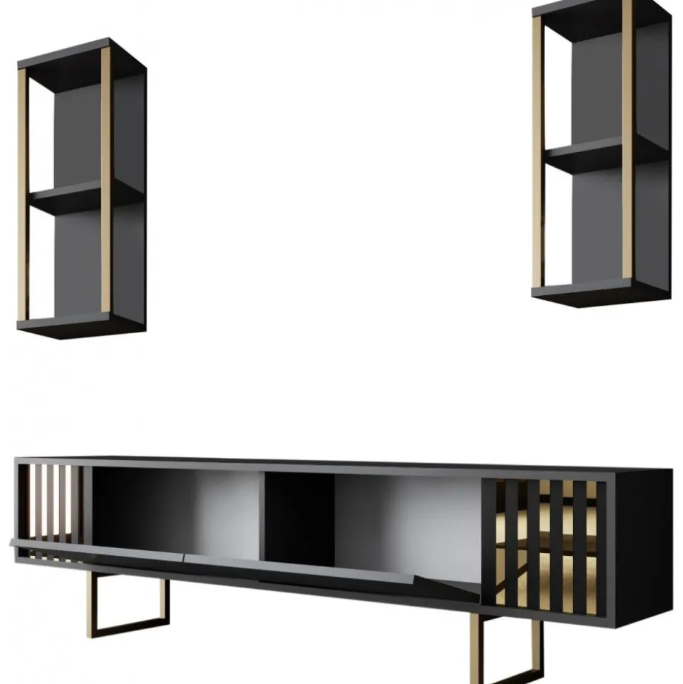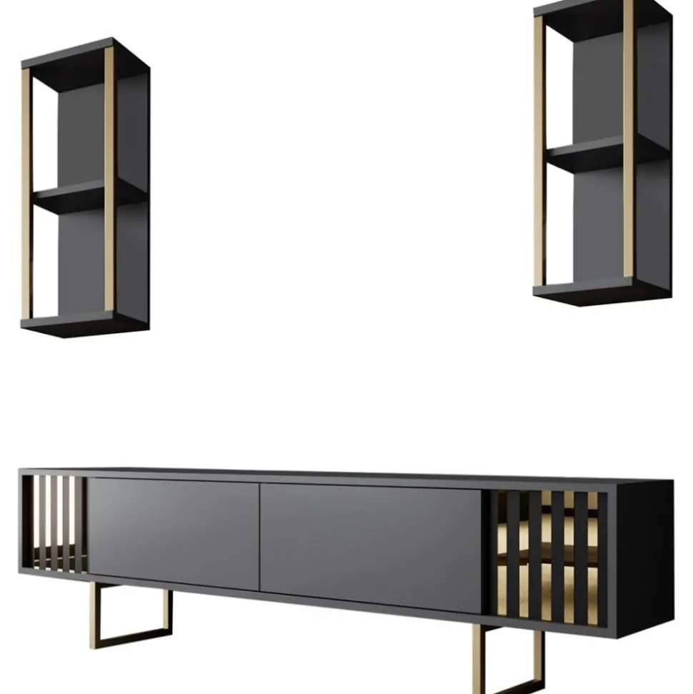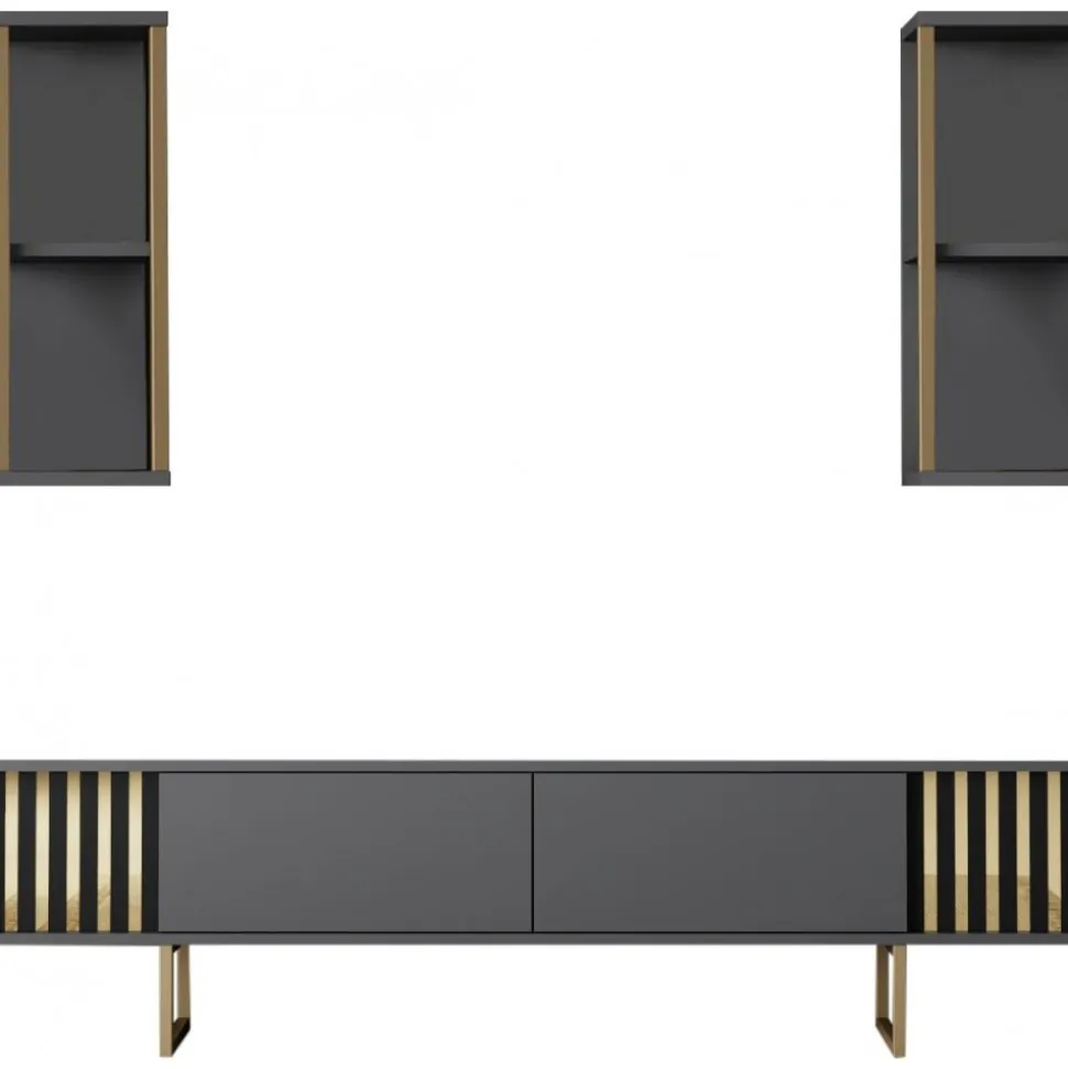 Mediabänk och vägghyllor av melaminbelagd spånskiva med ben av metall.