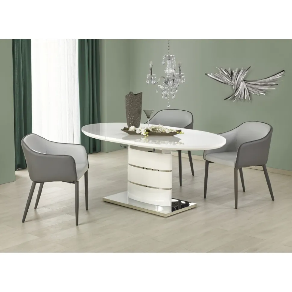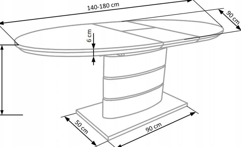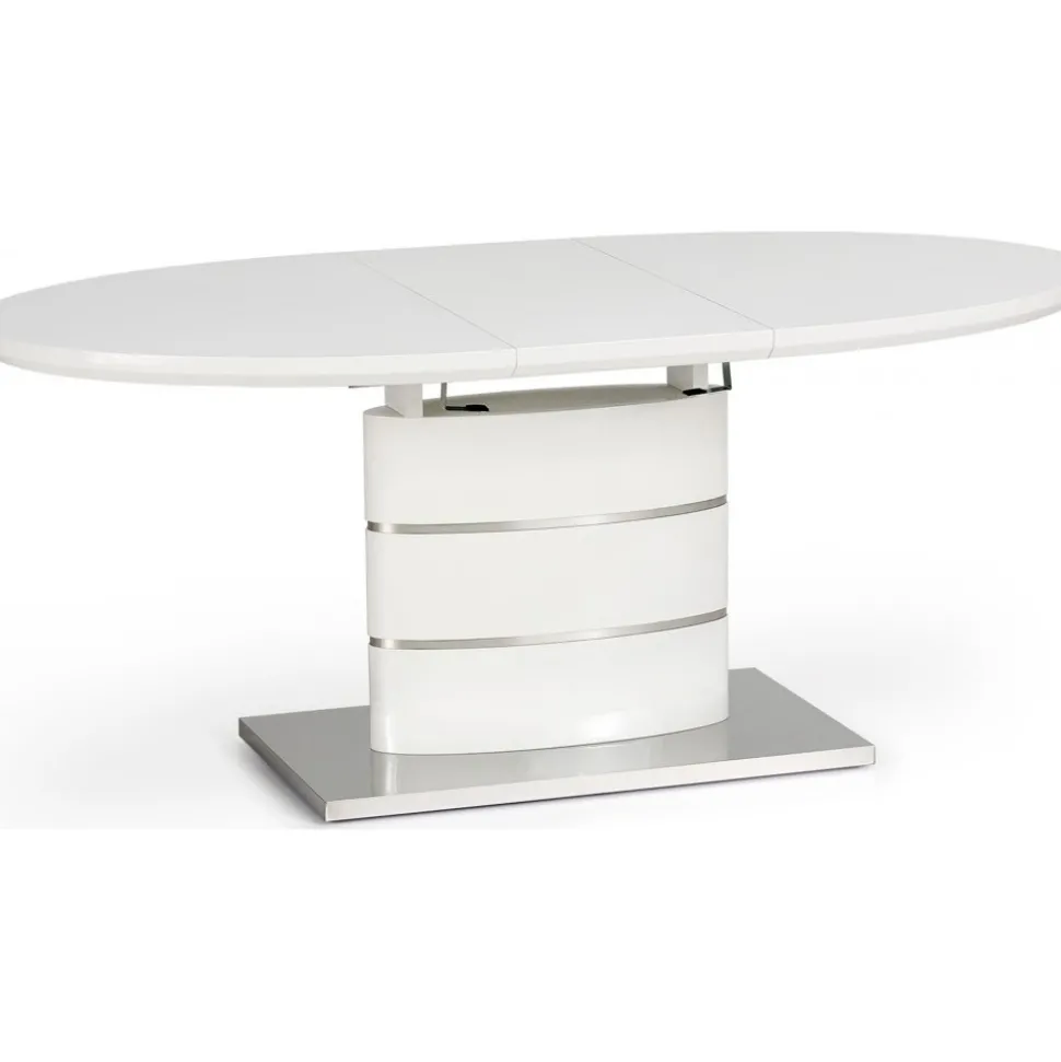 Ett elegant med en modern design. Underredet är tillverkat i metall och bordsskivan i vitlackerad MFP (premium träskiva). Bordet kan lätt förlängas från 140 cm till 180 cm, perfekt när man har ett lite större sällskap.