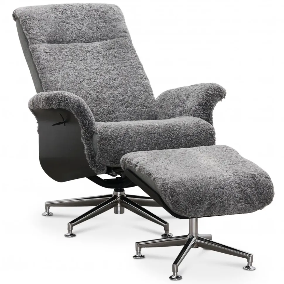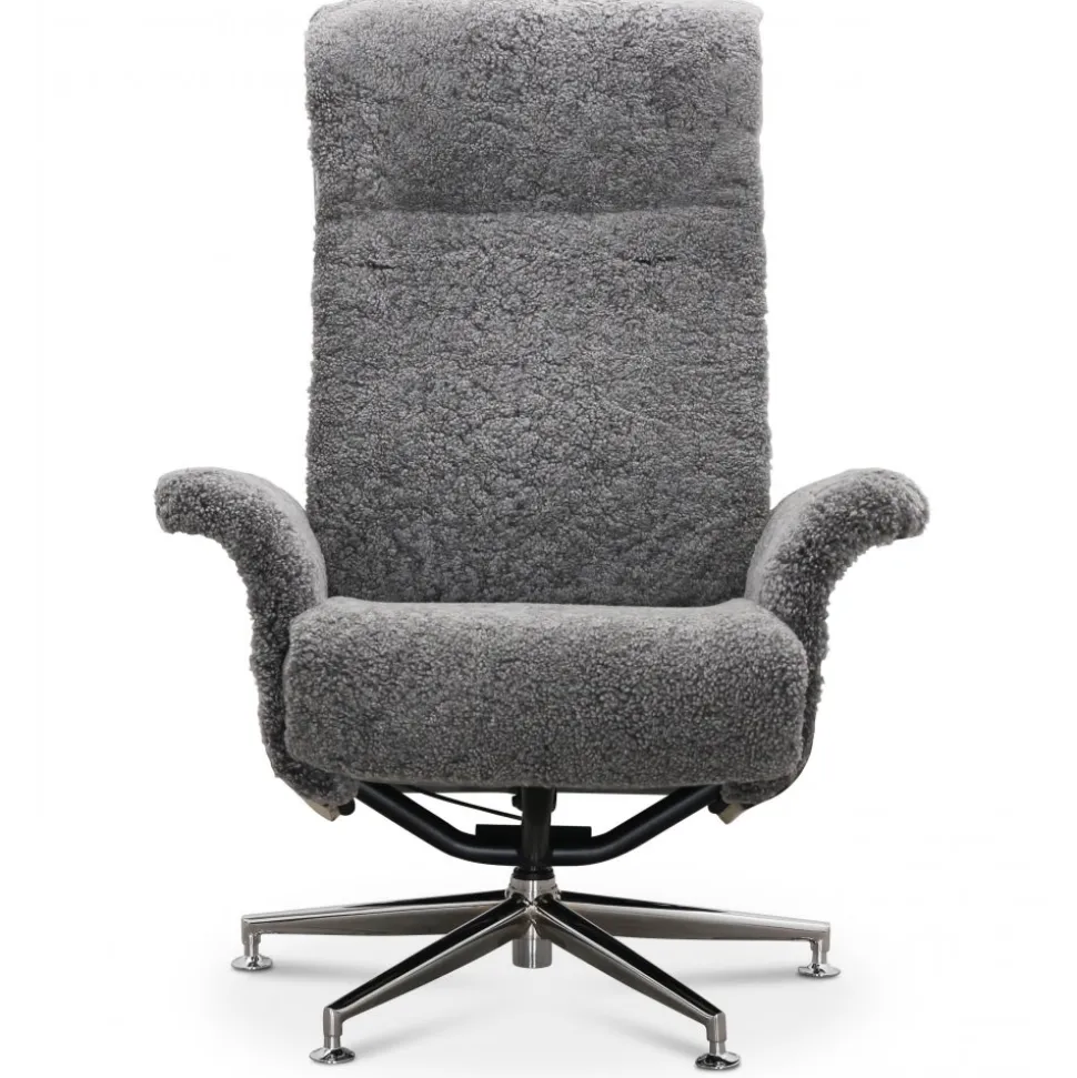 Fåtöljen är utrustad med en reclinerfunktion som kan justeras och låsas i olika lägen, detta gör att du enkelt kan hitta den perfekta positionen för avkoppling. Den medföljande fotpallen i matchande fårskinn höjer komforten yttligare och tillsammans med fåtöljen blir Ulla en perfekt kombination med moderna funktioner.