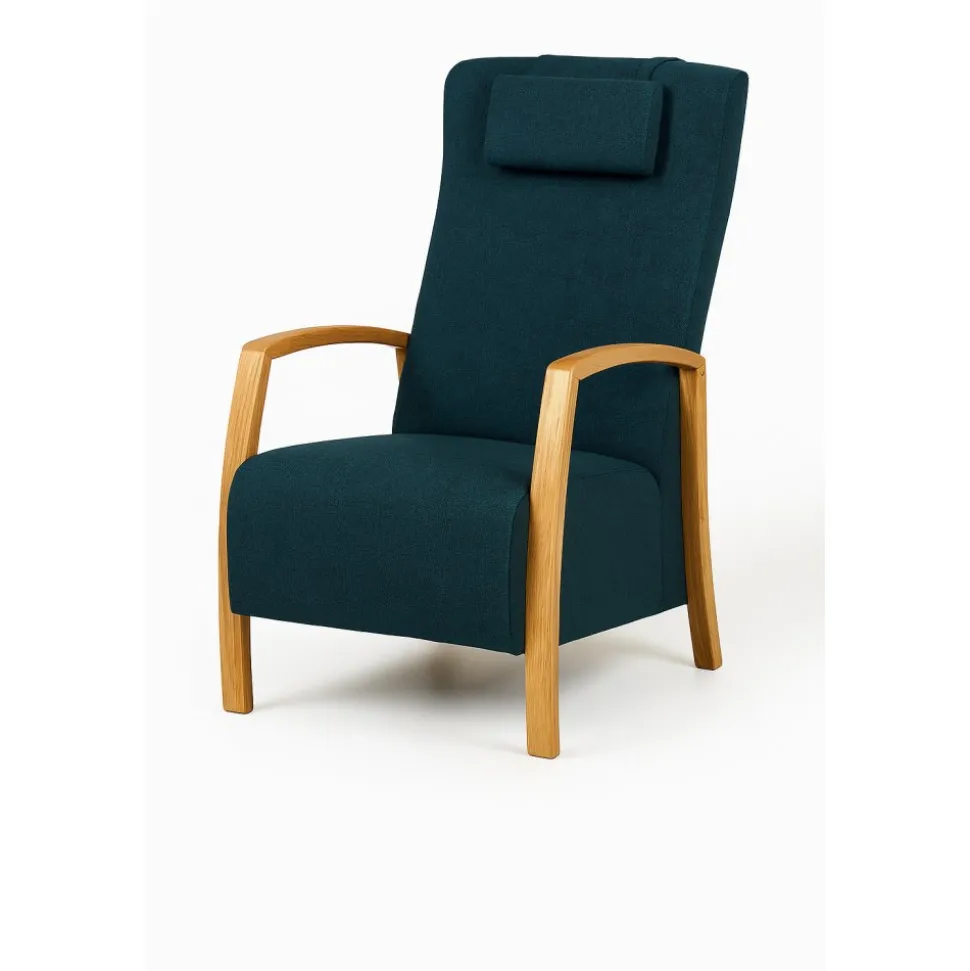 Fåtölj i mörkblått tyg med armstöd i ek – Zack