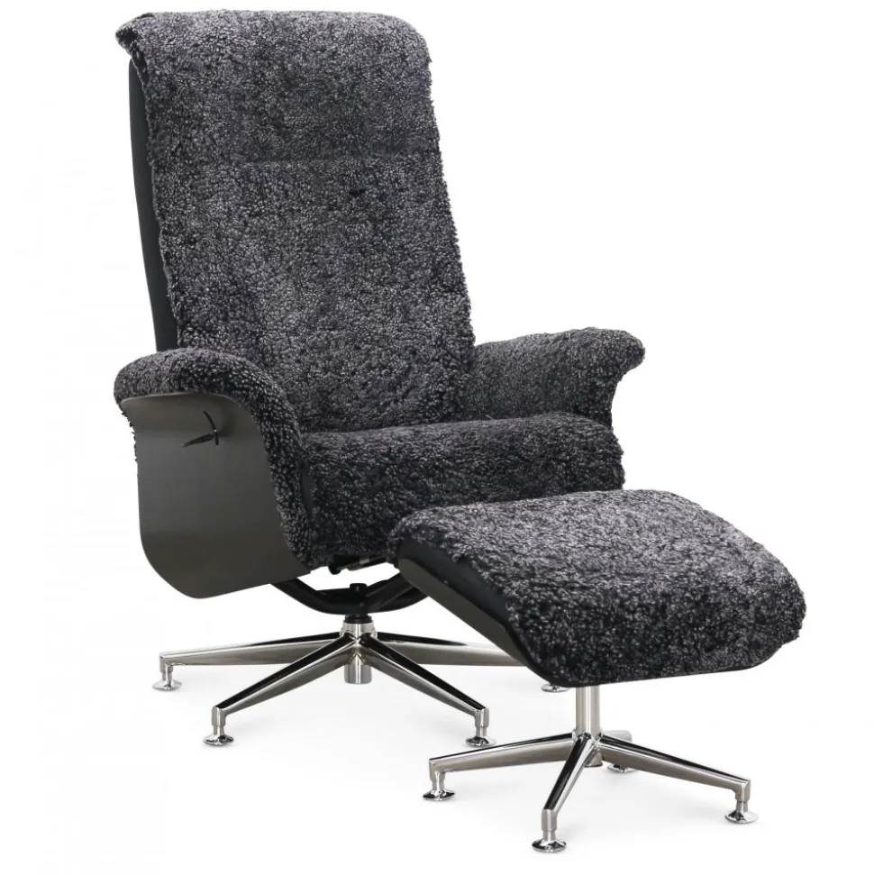- Fåtölj med fotpall fårskinn mörkgrå/svart – Ulla