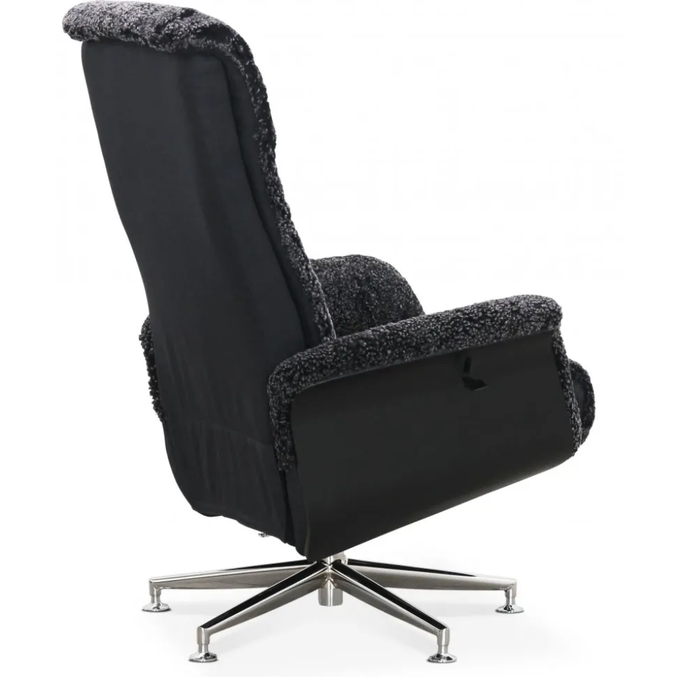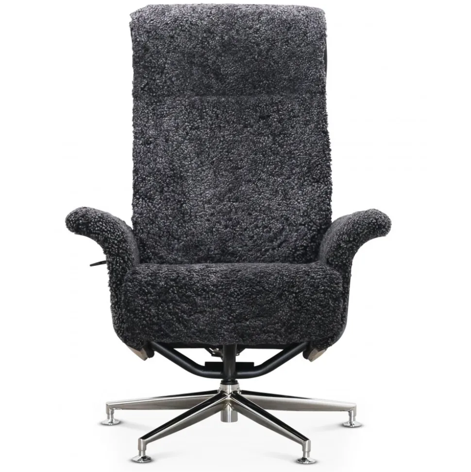 Reclinerfåtölj klädd i äkta mörkgrått fårskinn och har vackert svartbetsad ek på armstöden vilket gör den till en med klassisk känsla. Det kromade metallstativet ger en modern kontrast och förstärker den klassiska designen.