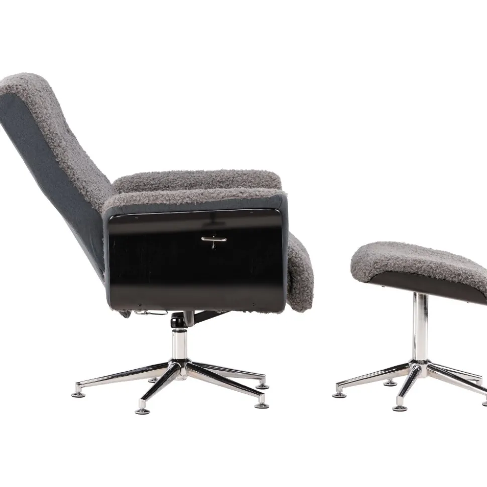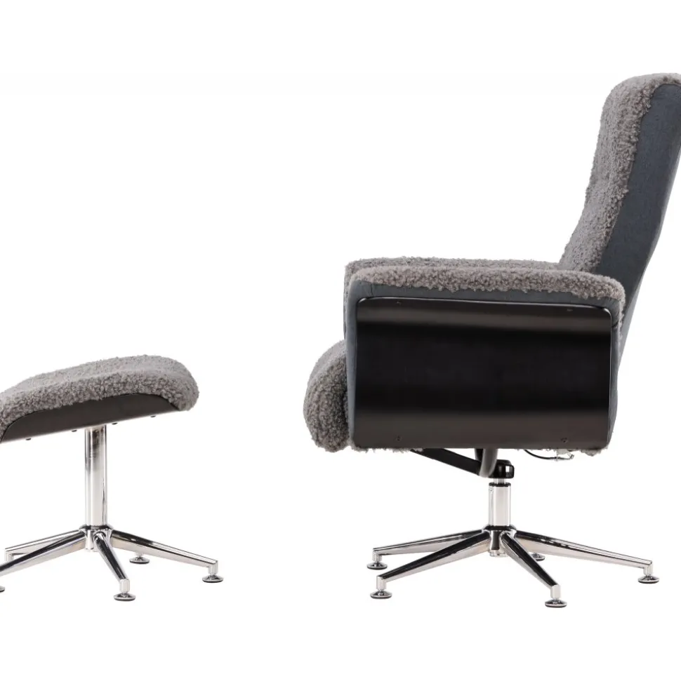 Här i grått teddy med trä på sidorna svartbetsat ekutförande samt snurrbart stativ i kromad metall för att återge ett exklusivt utseende och känsla. Recliner funktionen går att ställa och låsa i olika ställningar. Matchande fotpall ingår.
