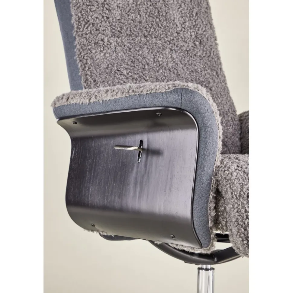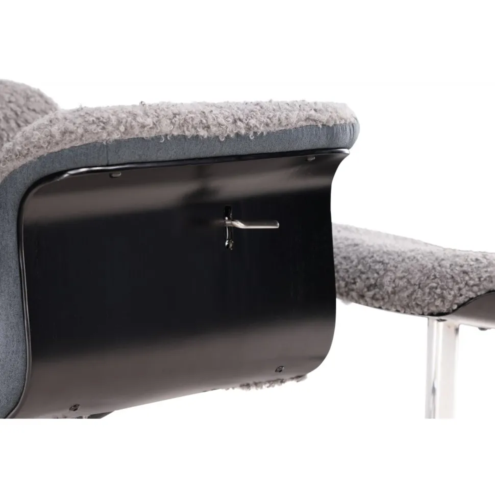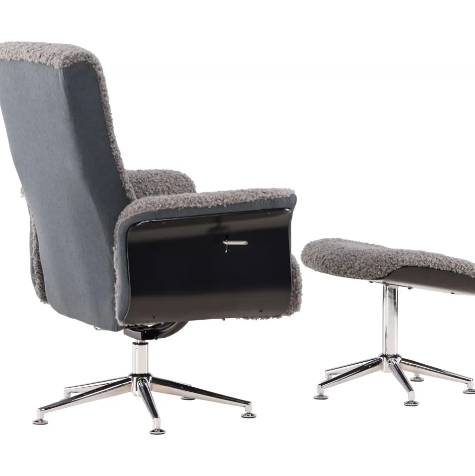 Här i grått teddy med trä på sidorna svartbetsat ekutförande samt snurrbart stativ i kromad metall för att återge ett exklusivt utseende och känsla. Recliner funktionen går att ställa och låsa i olika ställningar. Matchande fotpall ingår.