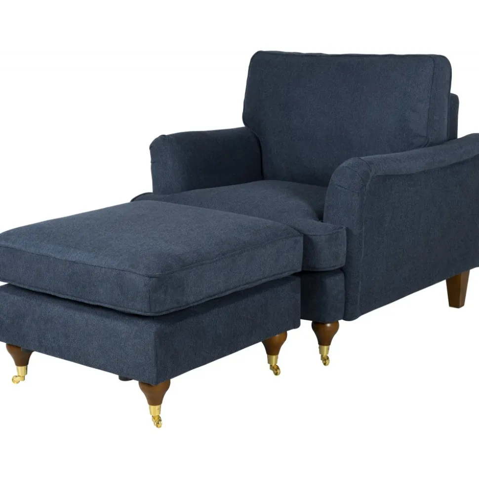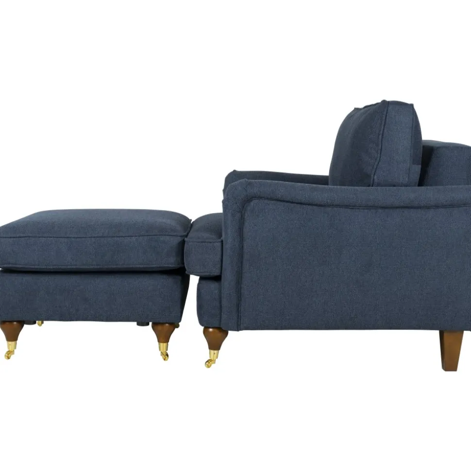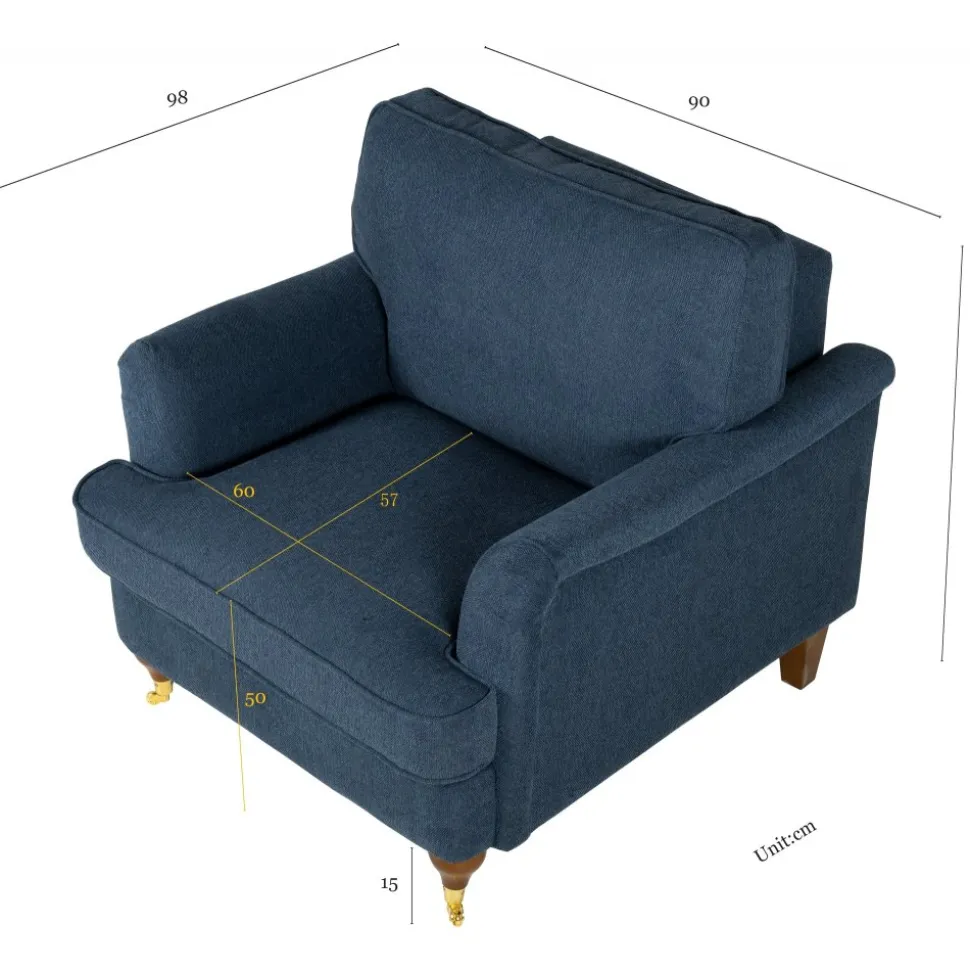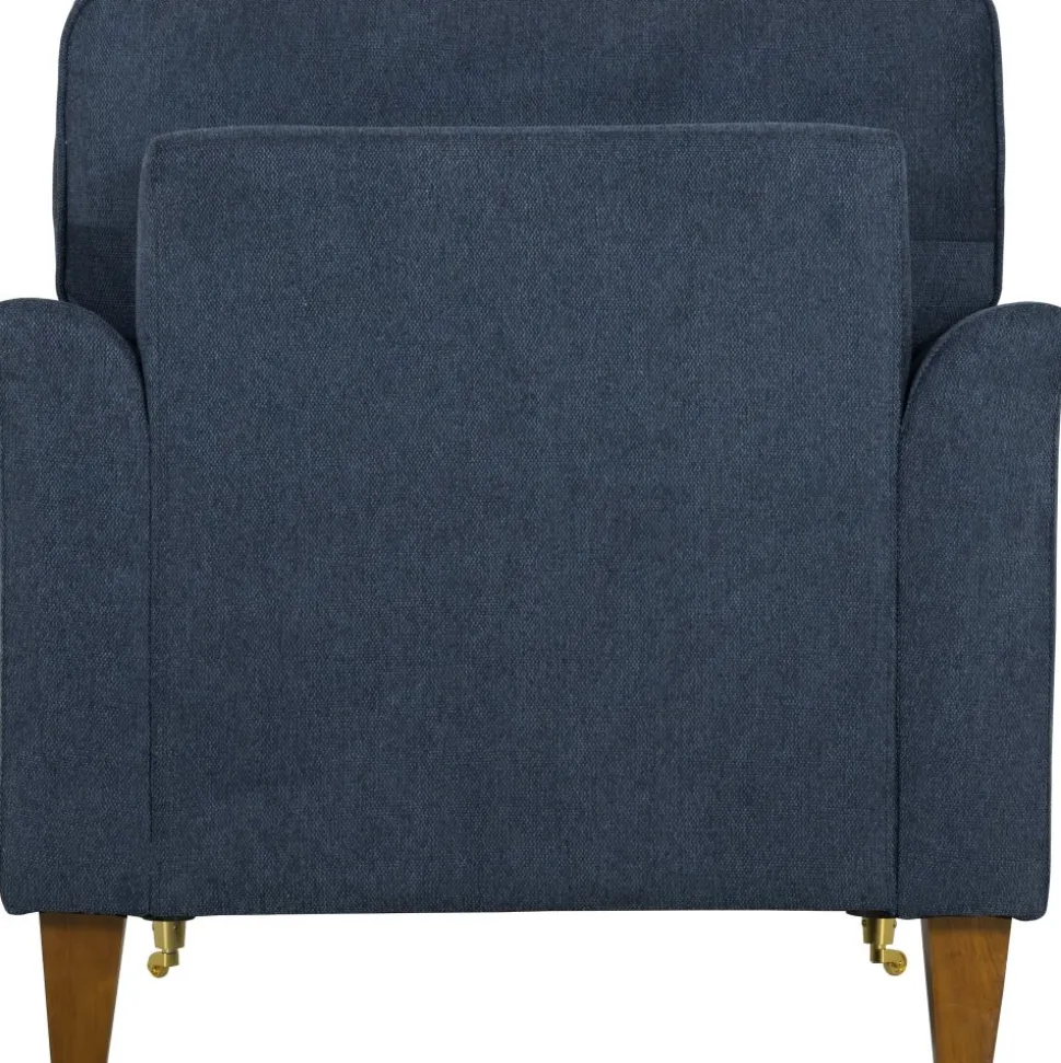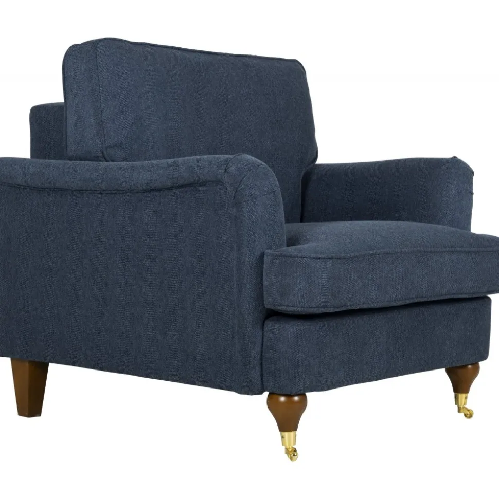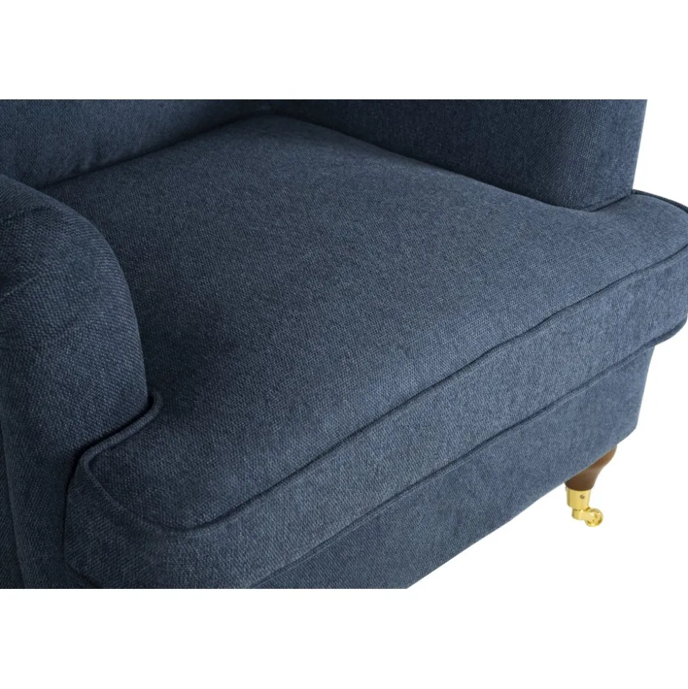 Fåtöljen finns i en mörkblå och stilren klädsel som passar i alla hem.