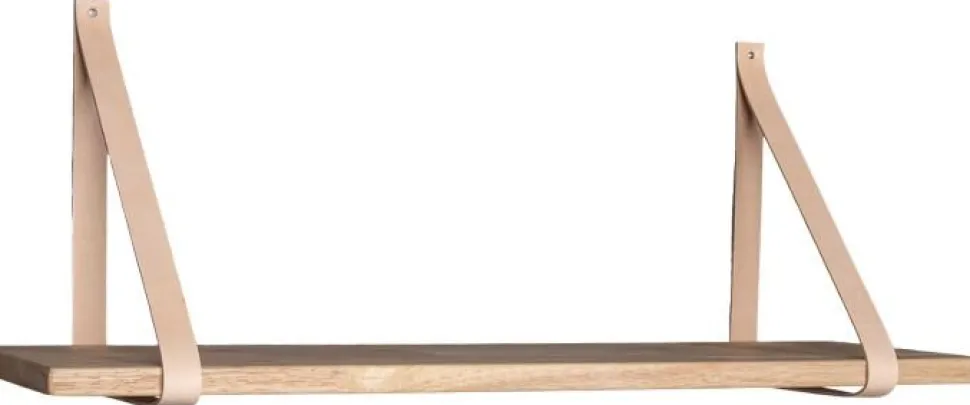 Vägghylla i oljat trä med bruna läderbälten.