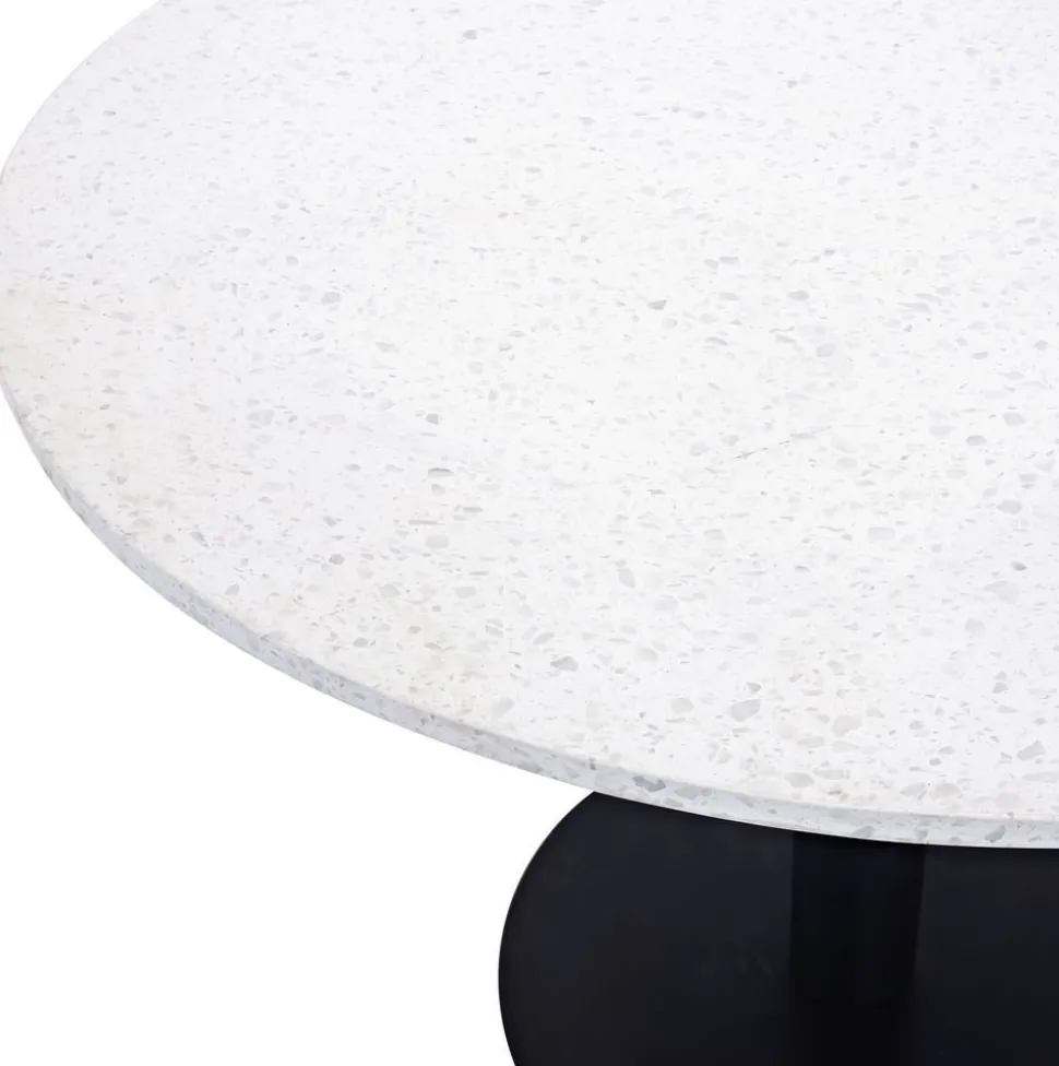 Modernt med vit Terazzo marmorskiva och underrede i svart metall.