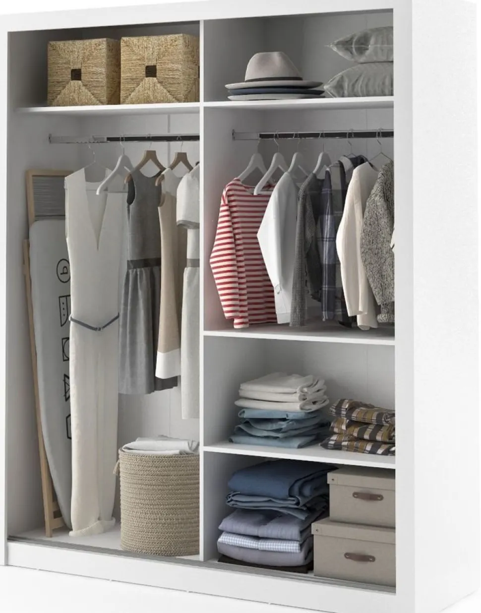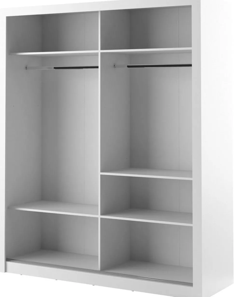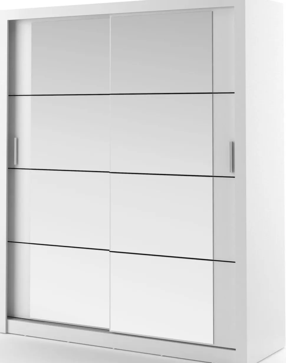 En snygg och mycket rymlig med en modern design. Tillverkad i Chipboard och med många förvaringsmöjligheter. Bakom de två skjutdörrarna med speglar, finner du massa med utrymme, klädstång och hyllplan. Handtag av plast med blank finish. Levereras omonterad.