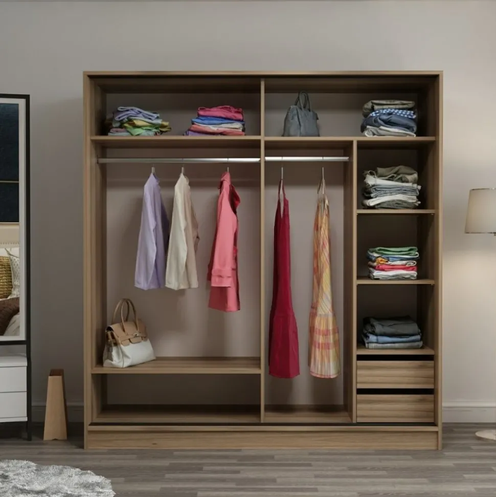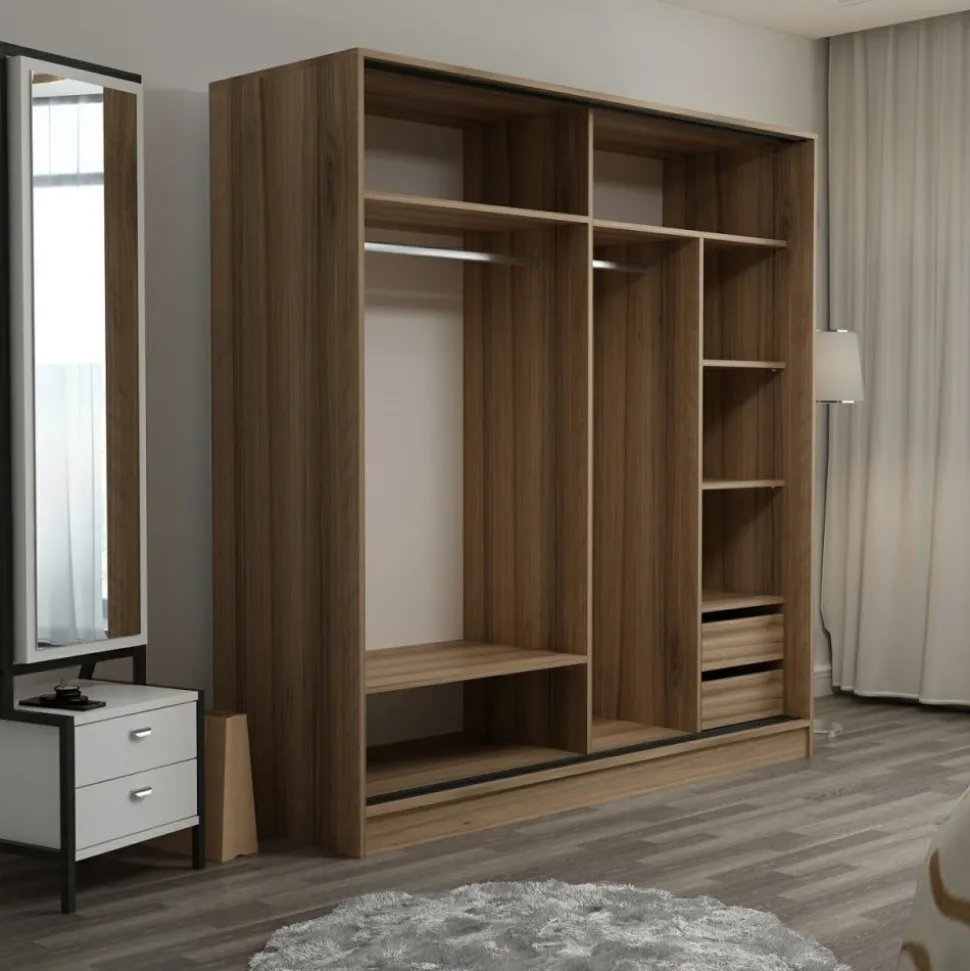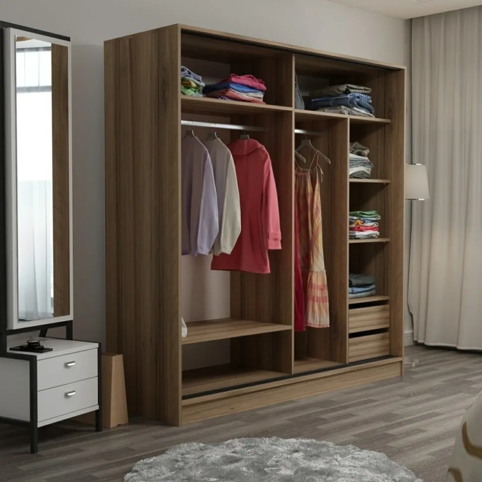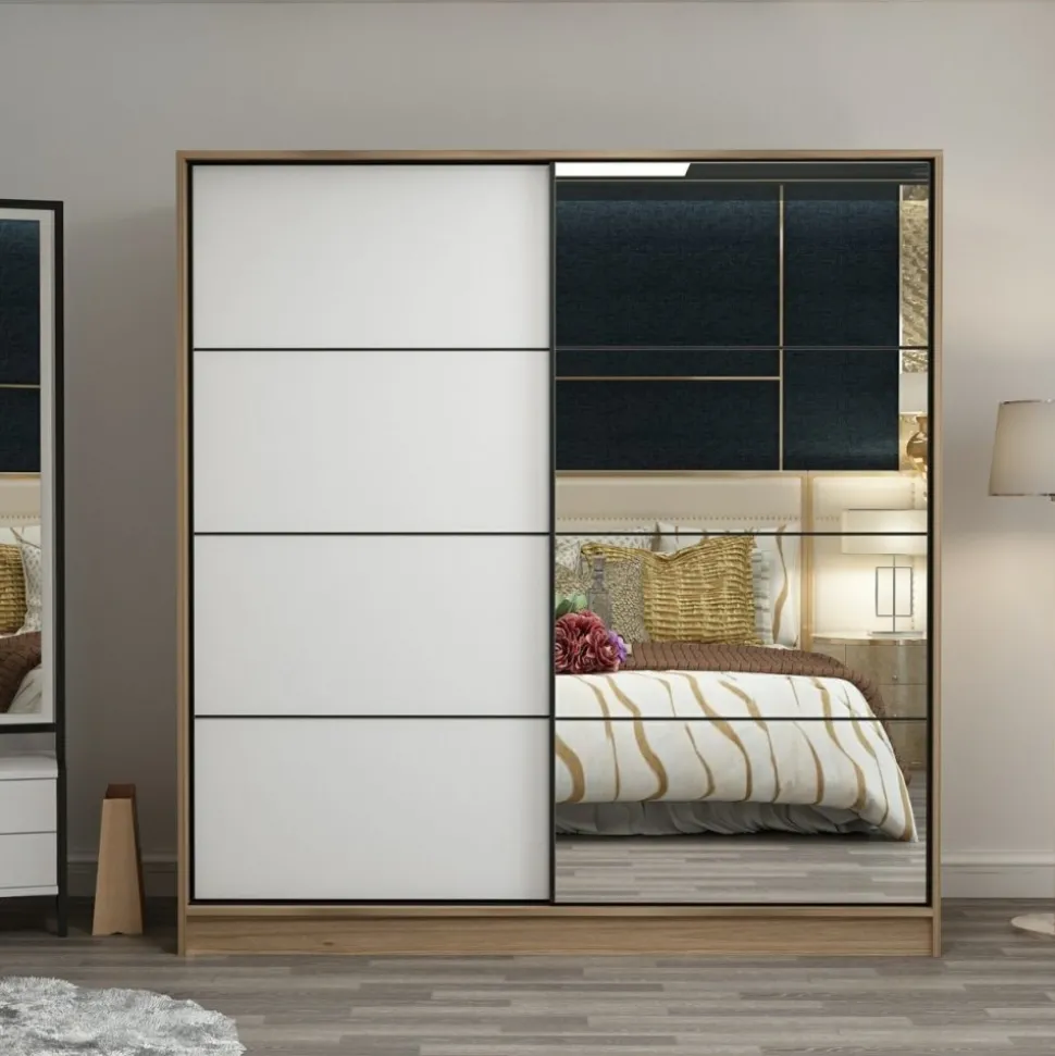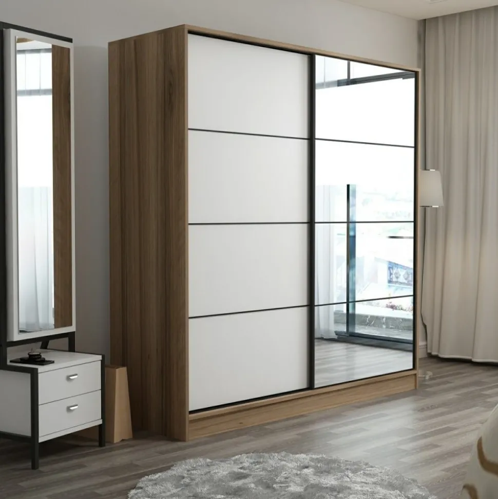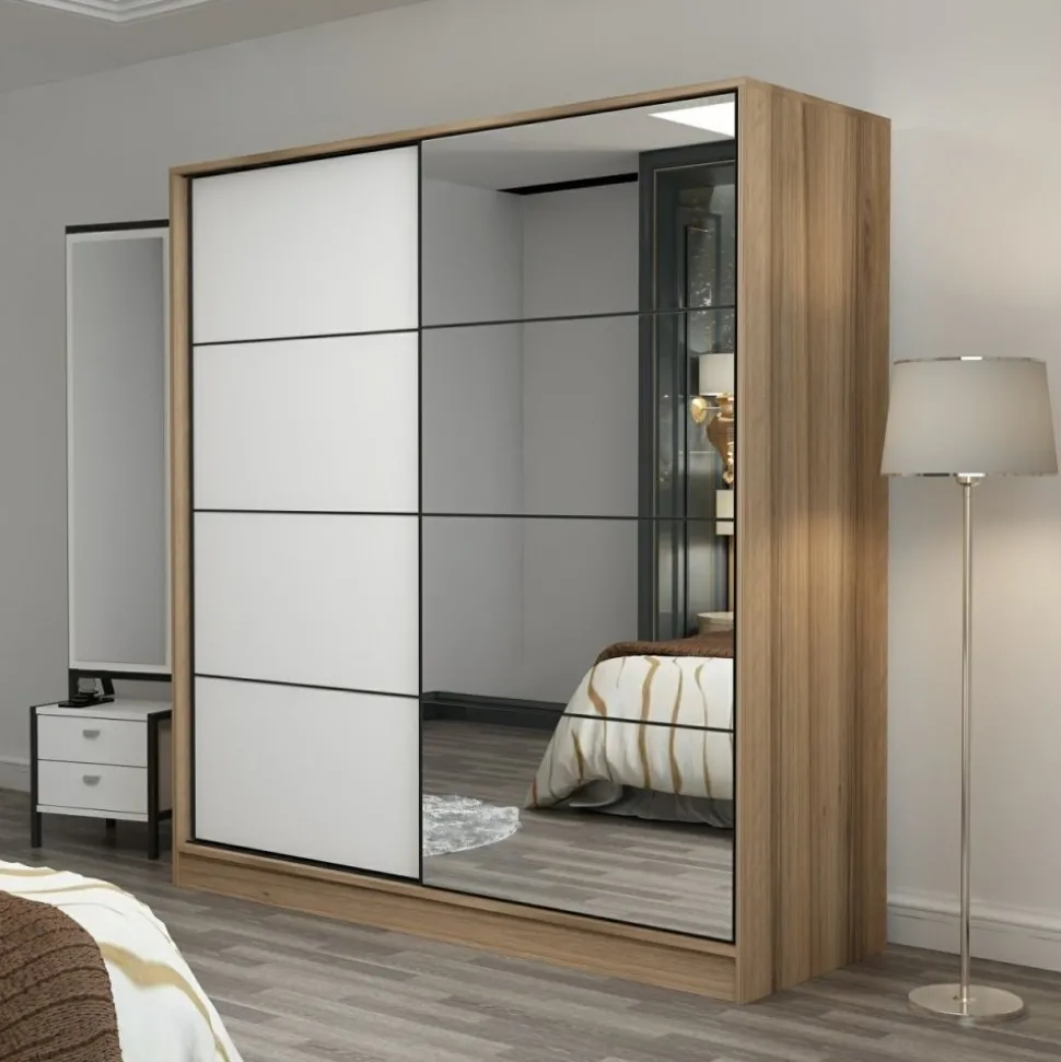 Garderob av trä med spegeldörr.