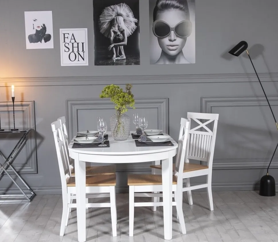 Klassiskt matgrupp, bord med underrede och toppskiva av massivt vitlackat trä. Modern stol i massivt heveaträ, vitlackad med sits av ekfanèr.