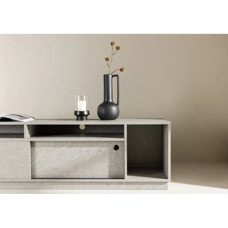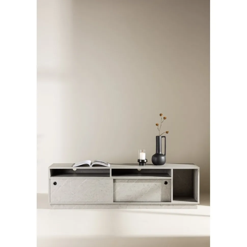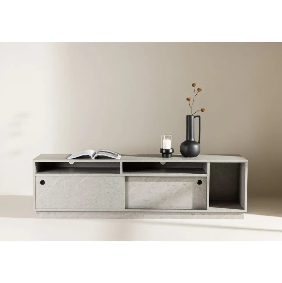 Skapa en trivsam atmosfär i ditt vardagsrum med vår Tv-bänk i grå betong-look från serien Girona! Med dess sofistikerade utseende och hållbara yta av grå melamin, lyfter Girona inte bara din inredning utan också din upplevelse av att organisera ditt utrymme. Girona Tv-bänk kombinerar funktion och stil på ett sätt som får dig att känna dig som en designexpert. De två skjutdörrarna, smidigt designade, gömmer ett rymligt hyllplan som enkelt rymmer dina förvaringsbehov. Vad sägs om att ha alla dina enheter, kablar och fjärrkontroller dolda bakom detta eleganta skåp? Det finns även öppna hyllfack som ger dig möjlighet att visa upp dina favoritprylar och ge ditt rum en touch av personlighet. Toppskivan är också perfekt för att skapa en stämning i ditt rum. Placera eleganta ljusstakar och högtalare på toppen och njut av den ultimata TV-upplevelsen i en atmosfär av ditt eget skapande. Välkommen till en ny nivå av inredning med Girona! Levereras omonterad.