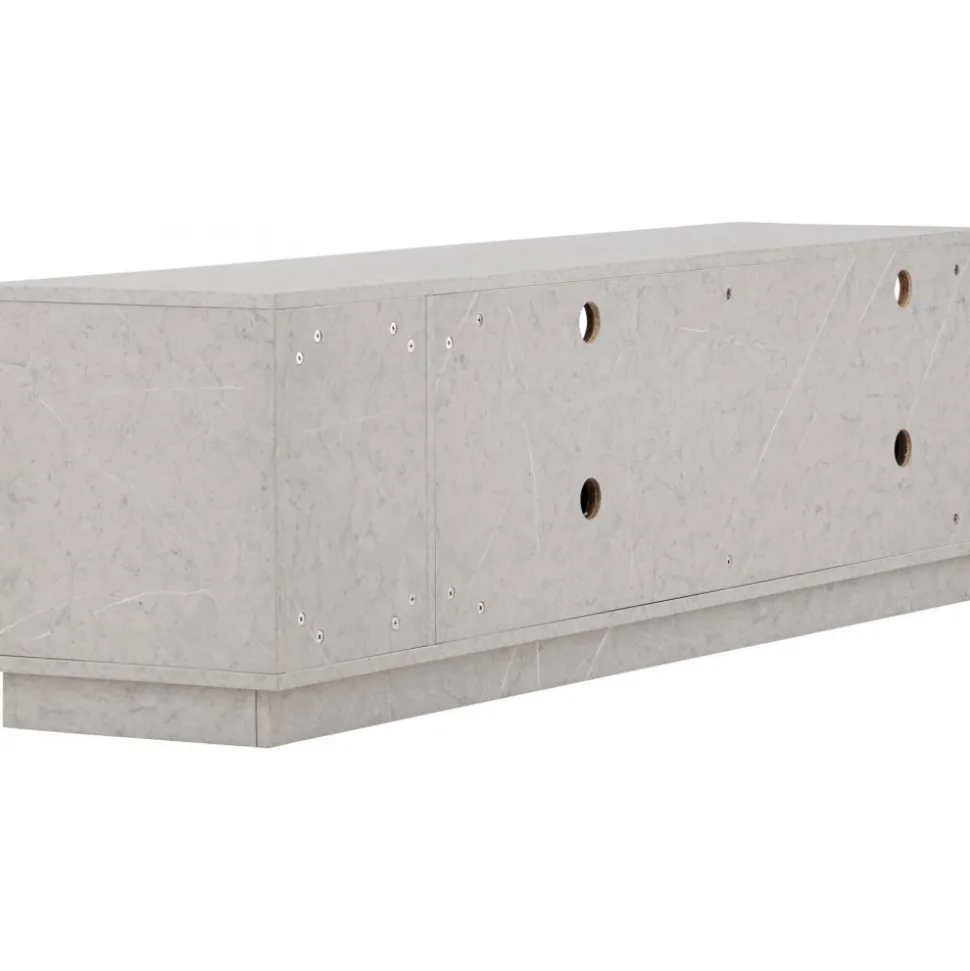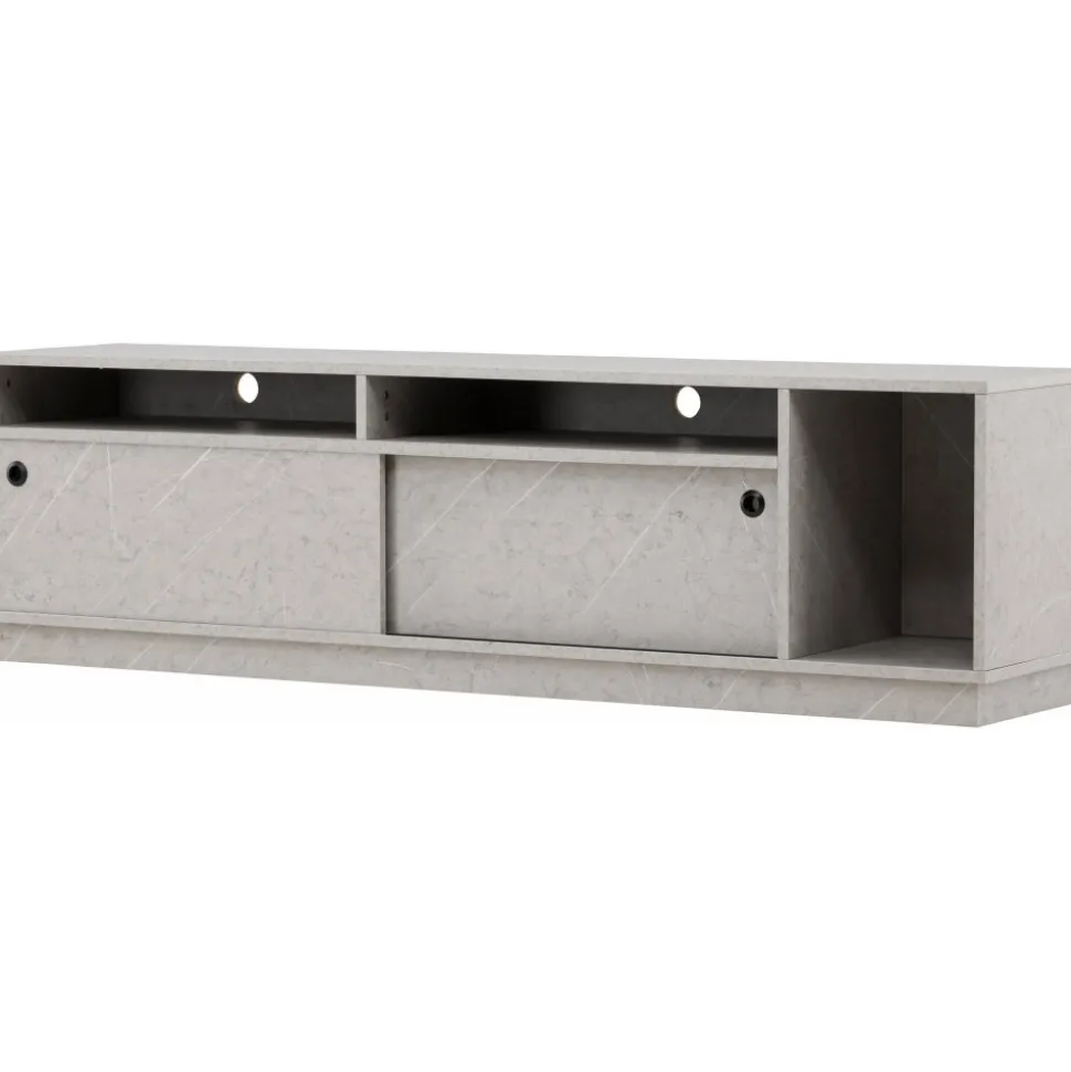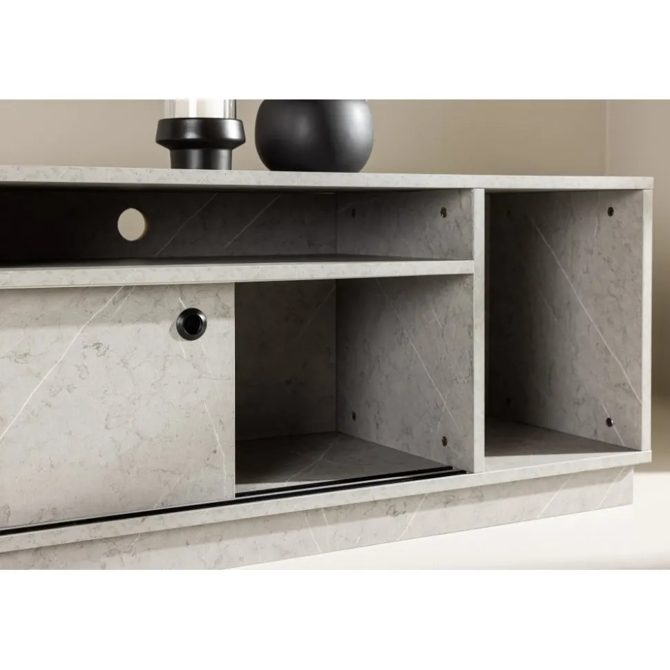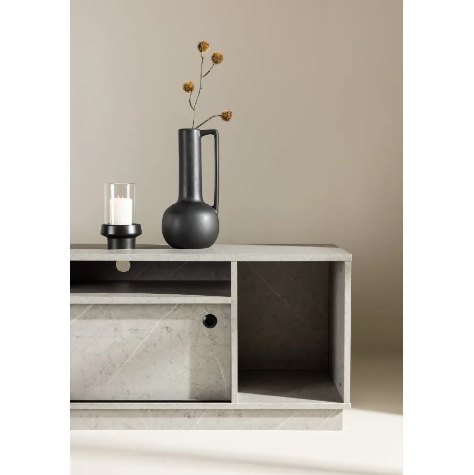 Skapa en trivsam atmosfär i ditt vardagsrum med vår Tv-bänk i grå betong-look från serien Girona! Med dess sofistikerade utseende och hållbara yta av grå melamin, lyfter Girona inte bara din inredning utan också din upplevelse av att organisera ditt utrymme. Girona Tv-bänk kombinerar funktion och stil på ett sätt som får dig att känna dig som en designexpert. De två skjutdörrarna, smidigt designade, gömmer ett rymligt hyllplan som enkelt rymmer dina förvaringsbehov. Vad sägs om att ha alla dina enheter, kablar och fjärrkontroller dolda bakom detta eleganta skåp? Det finns även öppna hyllfack som ger dig möjlighet att visa upp dina favoritprylar och ge ditt rum en touch av personlighet. Toppskivan är också perfekt för att skapa en stämning i ditt rum. Placera eleganta ljusstakar och högtalare på toppen och njut av den ultimata TV-upplevelsen i en atmosfär av ditt eget skapande. Välkommen till en ny nivå av inredning med Girona! Levereras omonterad.