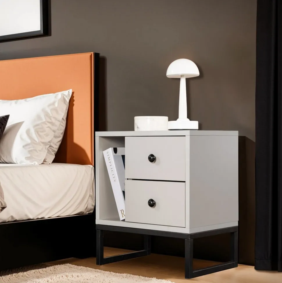 Sängbord av melaminbelagd spånskiva.