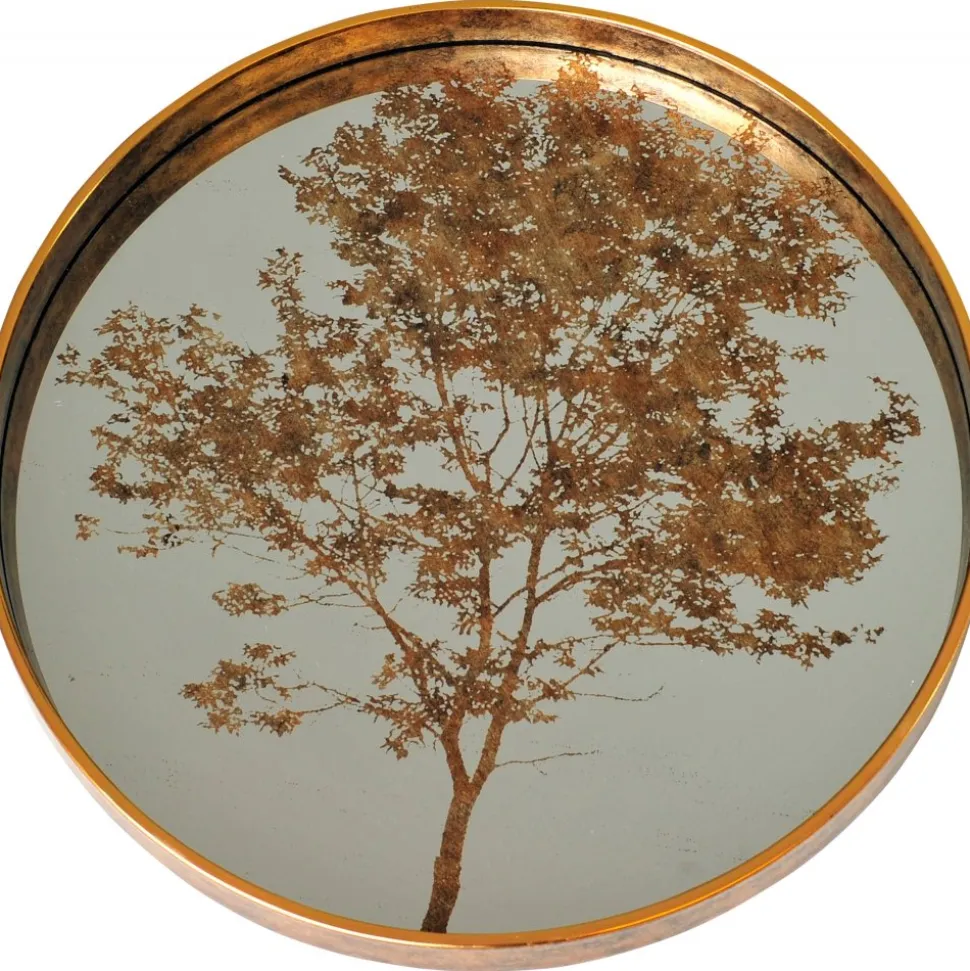 Rund serveringsbricka med sarg i mässingsfärgad metall och botten i spegelglas med motiv av ett träd.