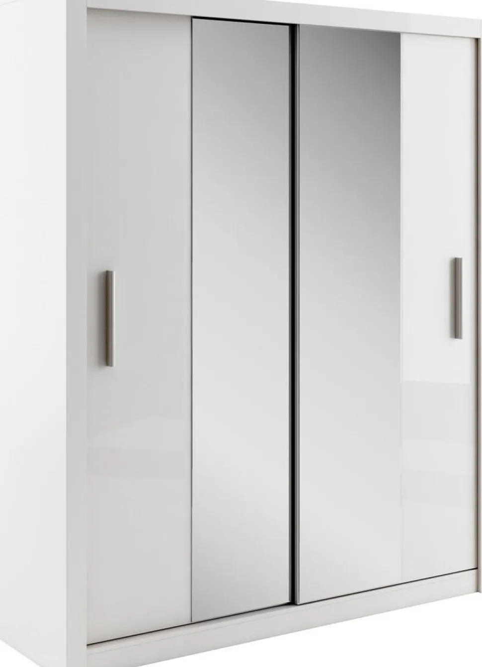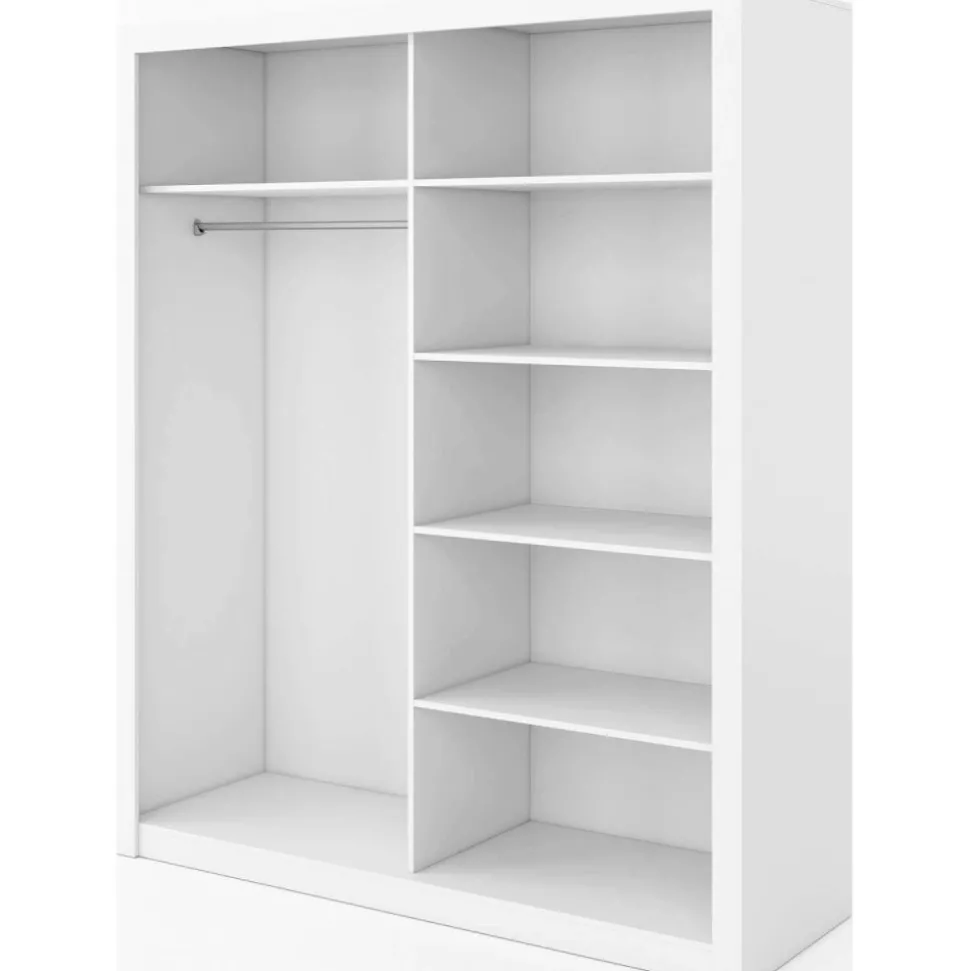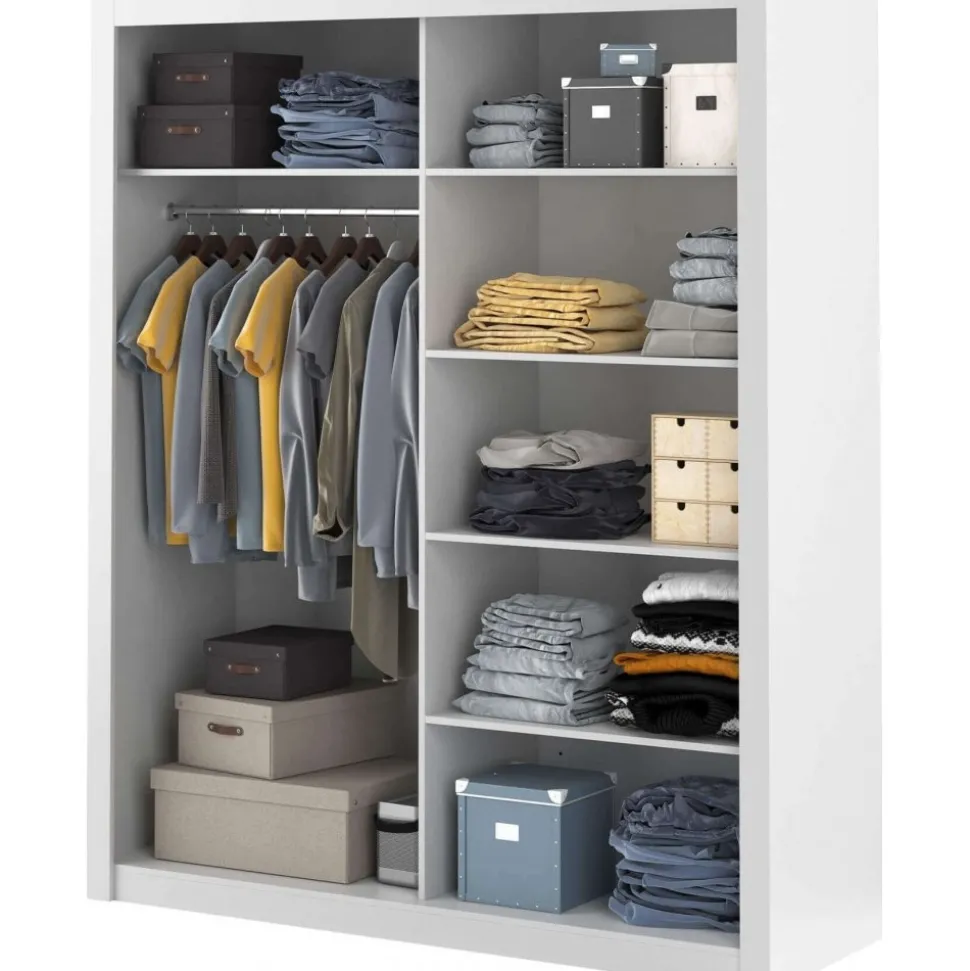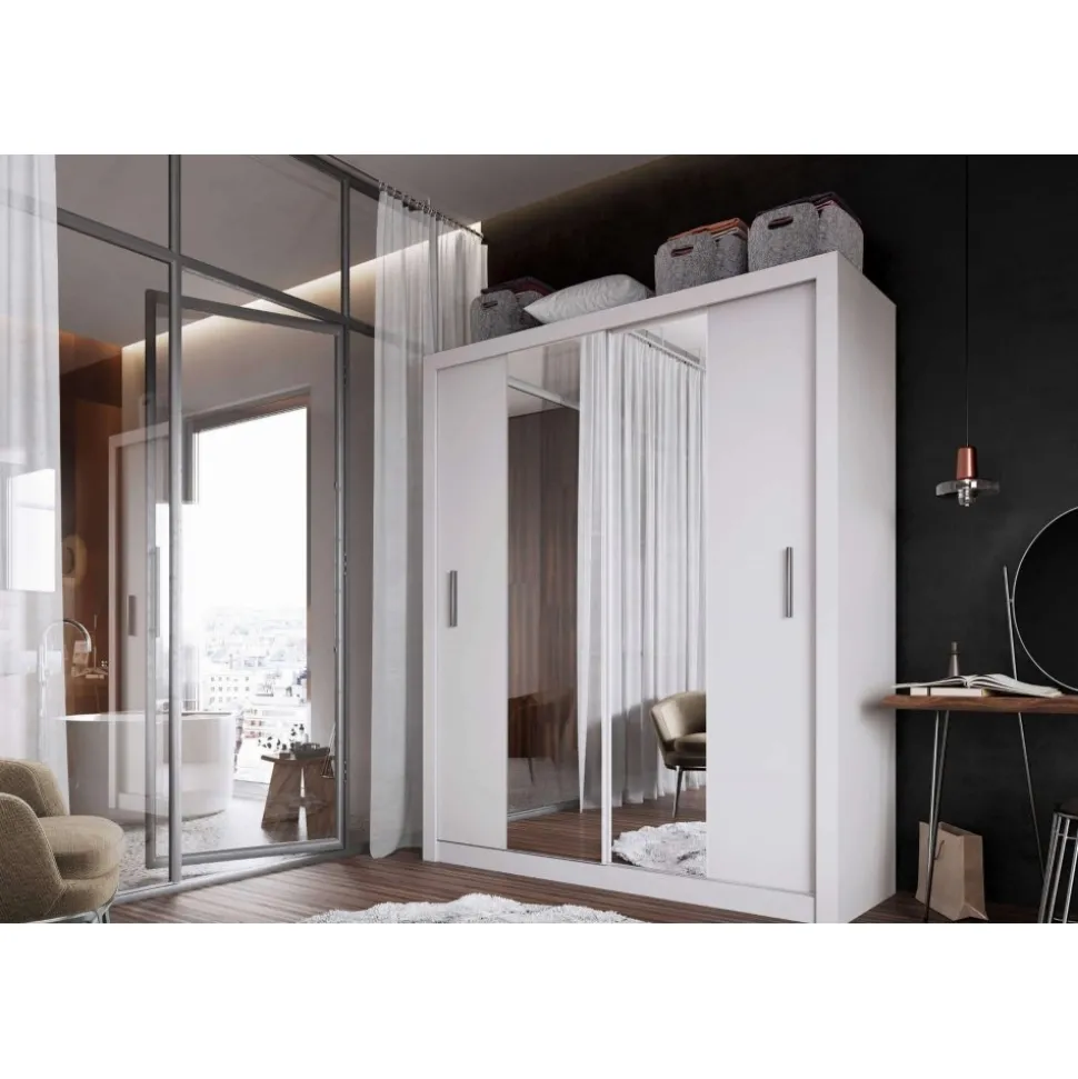 En snygg och mycket rymlig med en modern design. Tillverkad i Chipboard och med många förvaringsmöjligheter. Bakom de två skjutdörrarna med spegelglas, finner du massa med utrymme, klädstång och hyllplan. Handtag av plast med matt finish. Levereras omonterad.