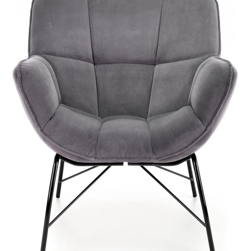 Fåtölj med underrede av pulverlackerad stål och klädsel av sammetstyg.