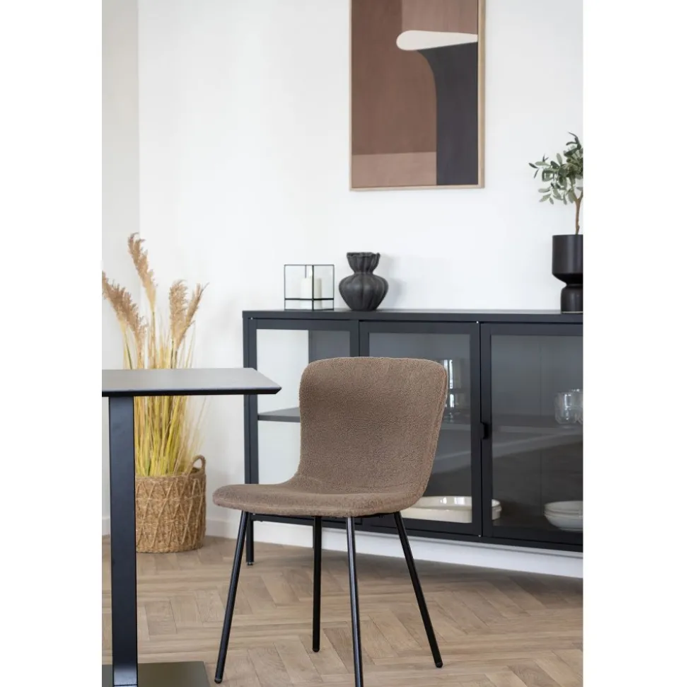 Matstol av plywood med klädsel av fuskpäls och underrede av stål. Levereras omonterad.