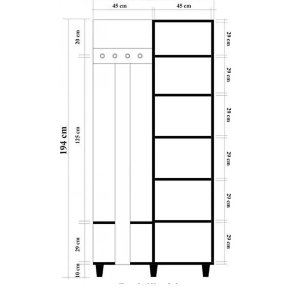 Praktisk och stilren som gör det enkelt att organisera både ytterkläder och skor. Den ena delen består av en klassisk garderob med flera hyllplan, perfekt för förvaring av skor, väskor eller andra saker du vill ha nära till hands i hallen. Den andra delen är en kombinerad sko- och hatthylla med krokar för jackor och kappor samt öppna hyllor för skor, mössor och accessoarer. Möbeln är tillverkad av melaminbelagd spånskiva i sonoma ek och står stadigt på ben av massiv avenbok. Med sin smarta design och varma träton skapar den ordning och en välkomnande känsla i hemmet.