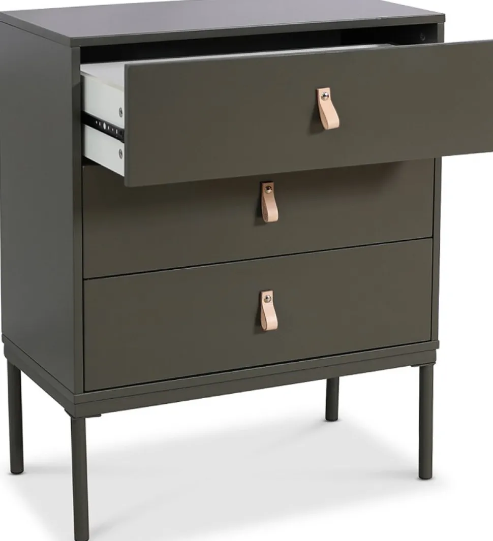 Fräck i grålackad MDF. Byrån har 3 rymliga lådor. Handtagen till lådorna är i skinn. Underrede i svartlackad metall för att ge en bra stabilitet.
