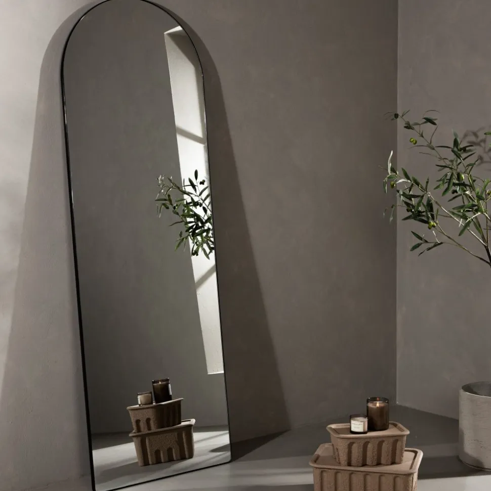 Ge ditt hem en tidlös detalj med denna stilrena helkroppsspegel i modern design. Den tunna svarta ramen och rundade toppen skapar ett elegant uttryck som passar lika bra i hallen som i sovrummet eller vardagsrummet. Spegelns generösa storlek reflekterar ljus och bidrar till en luftigare känsla i rummet.