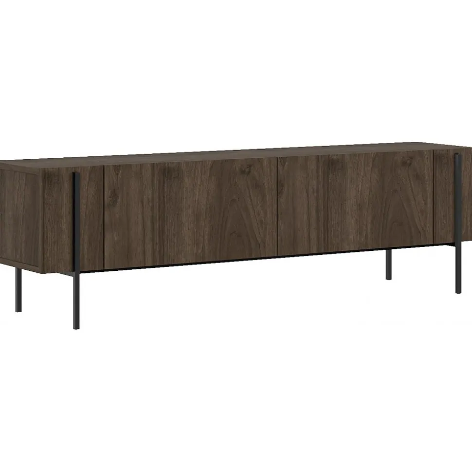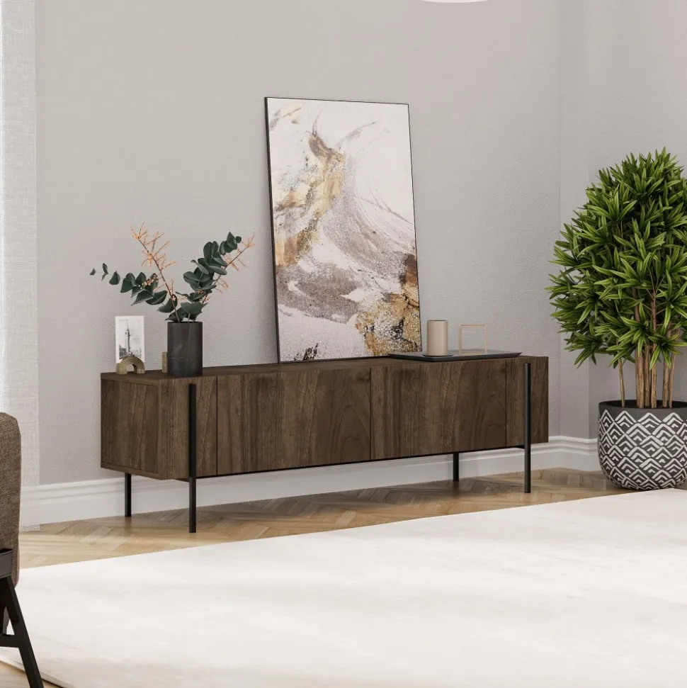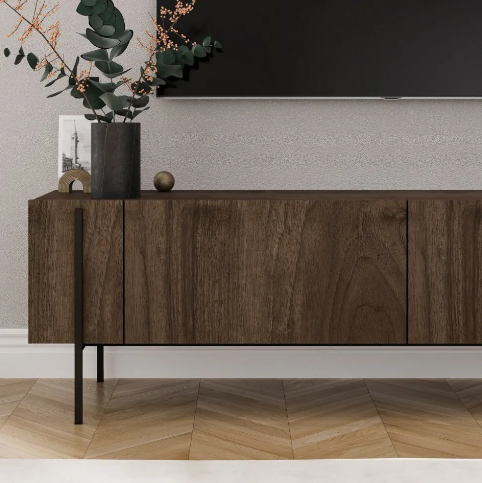 Förvandla ditt vardagsrum till ett elegant och organiserat utrymme med vår snygga mediabänk. Mediabänken är tillverkat av melaminbelagd spånskiva och är inte bara hållbart utan ger också en elegant touch till din heminredning. Den valnötsfärgade kulören ger en modern touch till alla rum, vilket gör det till det perfekta tillskottet till ditt underhållningsområde.