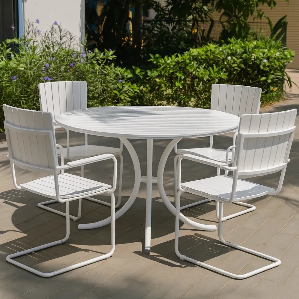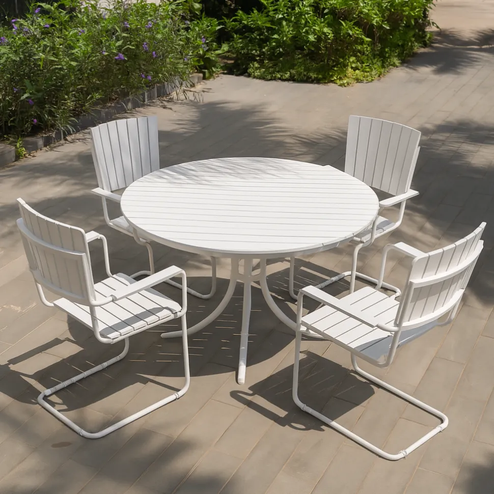 Utegruppen består av ett runt bord 130 cm i diameter med tillhörande 4 st karmstolar.
