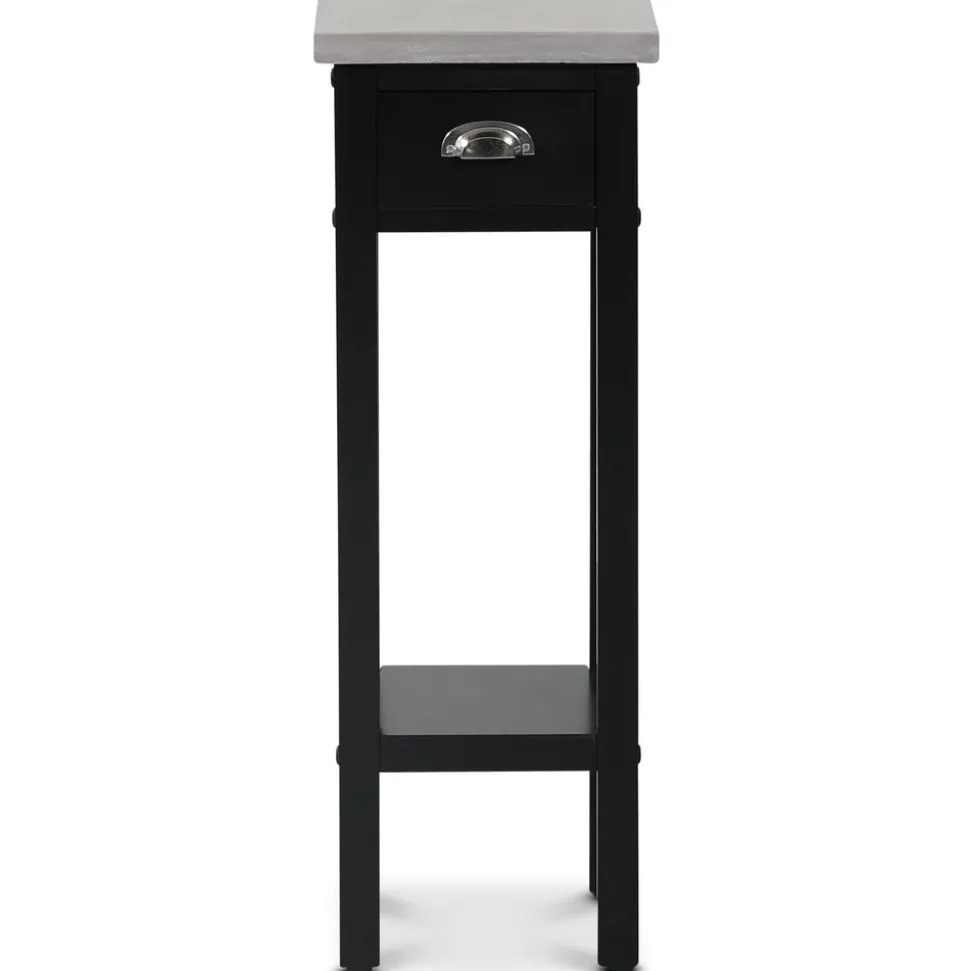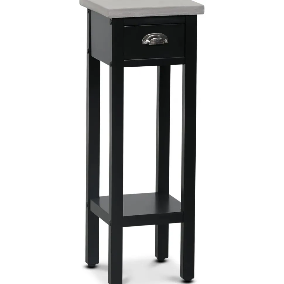Det svarta sängbordet är tillverkat av högkvalitativt trä med en toppskiva i microcement. Detta materialval ger bordet inte bara ett unikt och industriellt utseende utan också en lång hållbarhet.