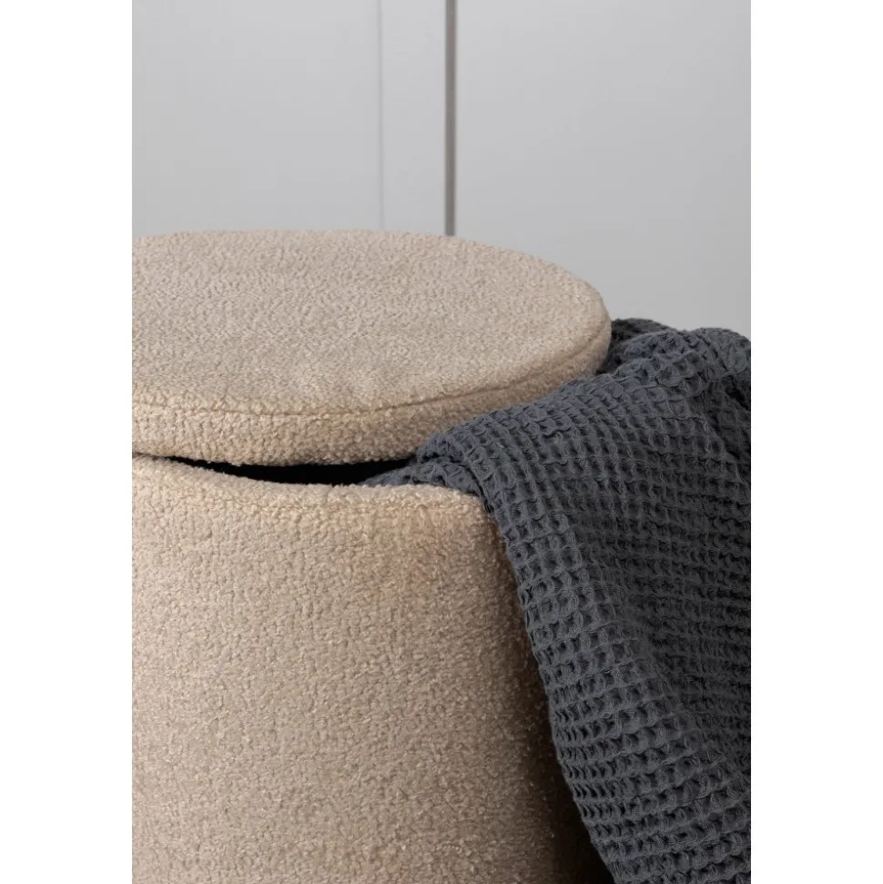Sittpuff av trä och stål, klädd med polyestertyg.