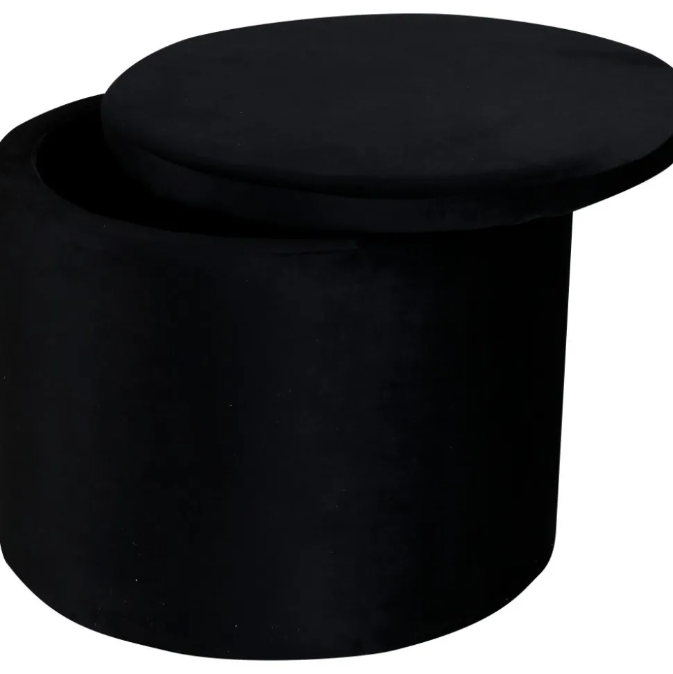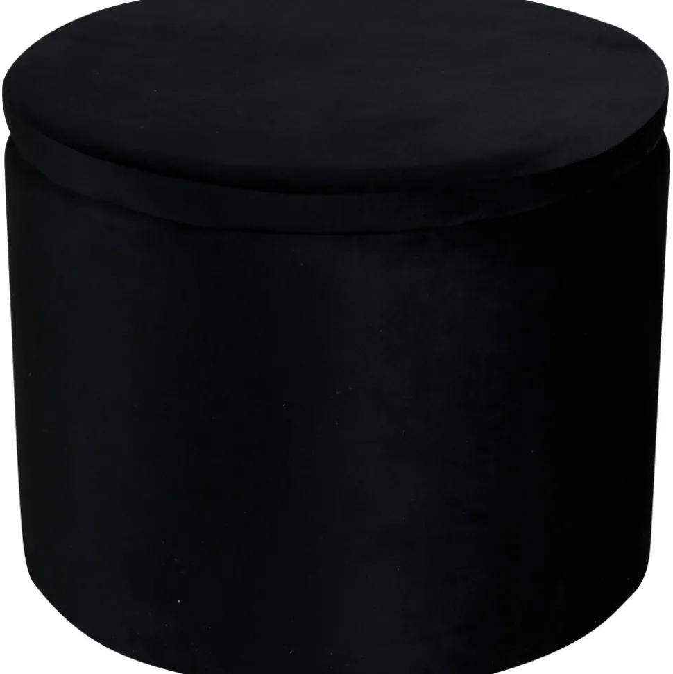 Sittpuff av trä och stål, klädd med polyestertyg.